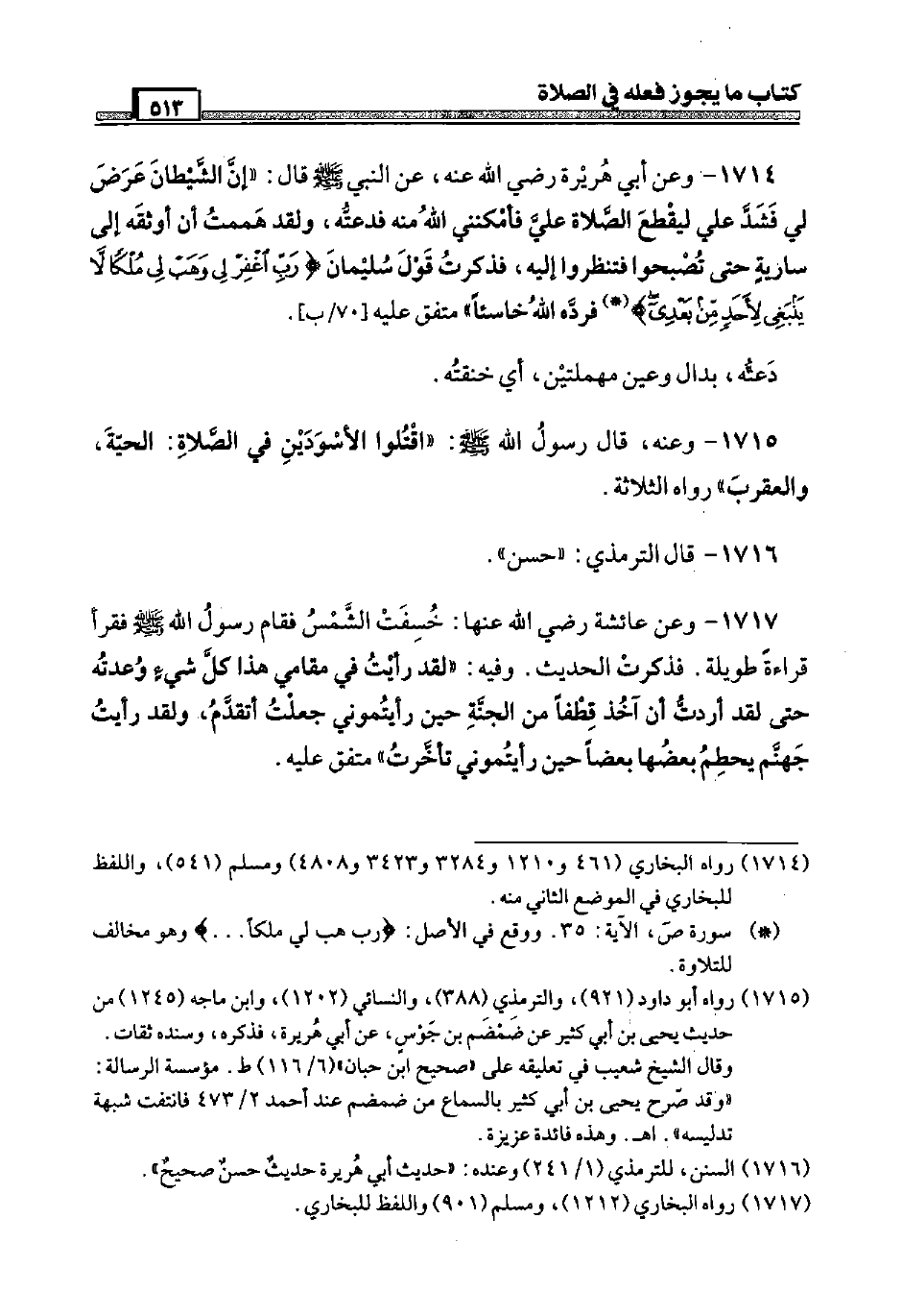 1714 - وَعَن أبي هُرَيْرَة رَضِيَ اللَّهُ عَنْه، عَن النَّبِي صَلَّى اللَّهُ عَلَيْهِ وَسَلَّم َ قَالَ: " إِن الشَّيْطَان عرض لي فَشد عَلّي ليقطع الصَّلَاة عَلّي فأمكنني الله مِنْهُ فدعته، وَلَقَد هَمَمْت أَن أوثقه إِلَى سَارِيَة حَتَّى تصبحوا فتنظروا إِلَيْهِ، فَذكرت قَول سُلَيْمَان {رب اغْفِر لي وهب لي ملكا لَا يَنْبَغِي لأحد من بعدِي} فَرده الله خاسئا " مُتَّفق عَلَيْهِ [70 / ب] . دَعَتْهُ، بدال وَعين مهملتين، أَي خنقته.