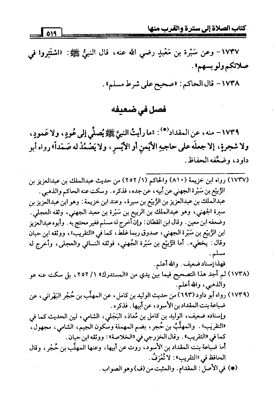 1739 - مِنْهُ، عَن الْمِقْدَاد: " مَا رَأَيْت النَّبِي صَلَّى اللَّهُ عَلَيْهِ وَسَلَّم َ يُصَلِّي إِلَى عود، وَلَا عَمُود، وَلَا شَجَرَة، إِلَّا جعله عَلَى حَاجِبه الْأَيْمن أَو الْأَيْسَر، وَلَا يصمد لَهُ صمدا " رَوَاهُ أَبُو دَاوُد وَضَعفه الْحفاظ.
