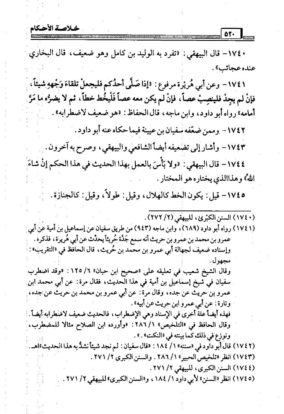 1741 - وَعَن أبي هُرَيْرَة مَرْفُوع: " إِذا صَلَّى أحدكُم فليجعل تِلْقَاء وَجهه شَيْئا، فَإِن لم يجد فلينصب عَصا، فَإِن لم يكن مَعَه عَصا فليخط خطا، ثمَّ لَا يضرّهُ مَا مر أَمَامه " رَوَاهُ أَبُو دَاوُد، وَابْن ماجة، قَالَ الْحفاظ: " هُوَ ضَعِيف لاضطرابه ".