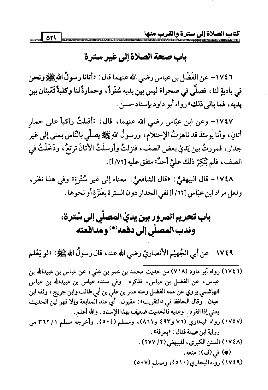 1746 - عَن الْفضل بن عَبَّاس رَضِيَ اللَّهُ عَنْهما قَالَ: " أَتَانَا رَسُول الله صَلَّى اللَّهُ عَلَيْهِ وَسَلَّم َ وَنحن فِي بادية لنا، فَصَلى فِي صحراء لَيْسَ بَين يَدَيْهِ ستْرَة وحمارة لنا وكلبة تعبثان بَين يَدَيْهِ، فَمَا بالى ذَلِك " رَوَاهُ أَبُو دَاوُد بِإِسْنَاد حسن.
