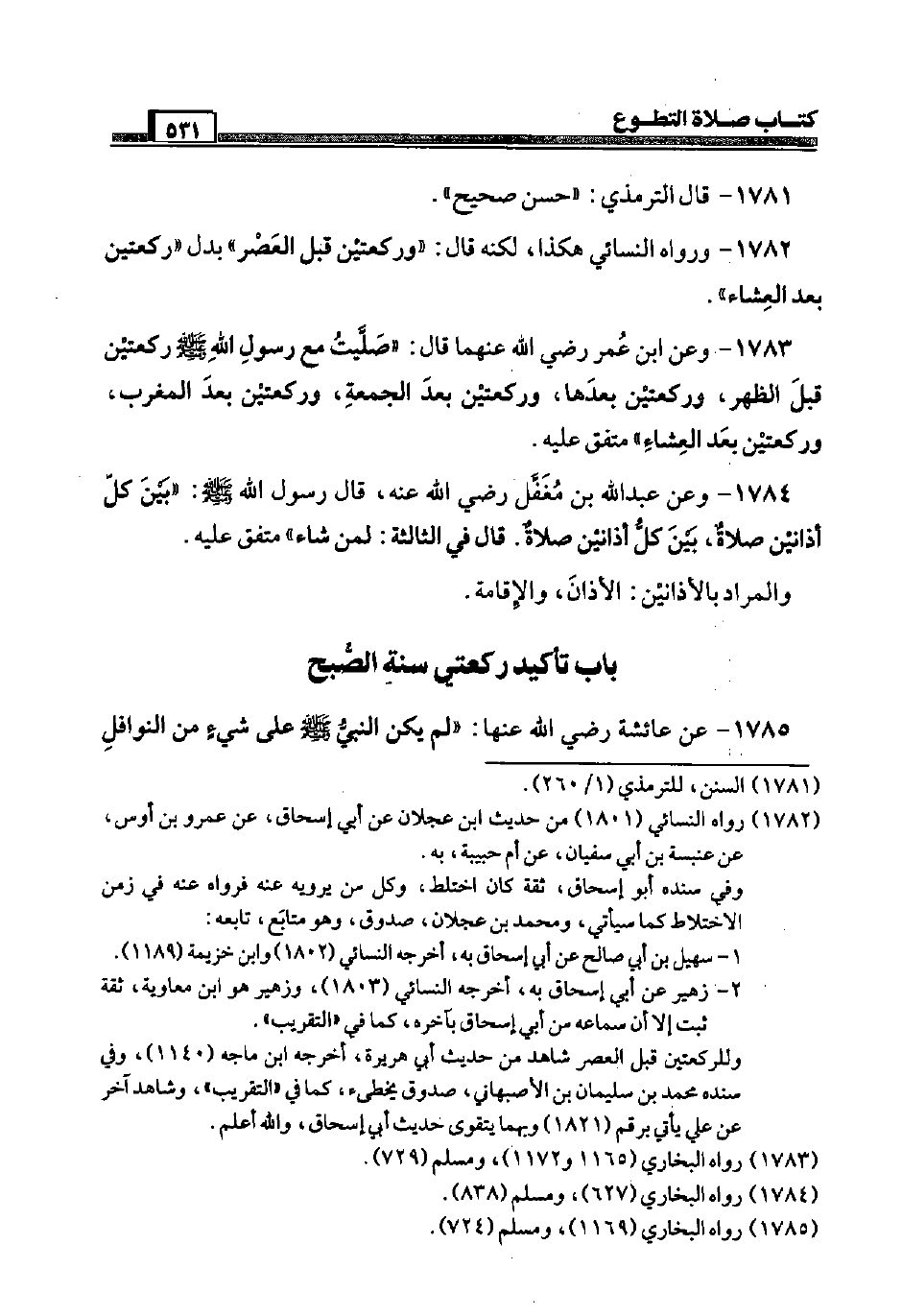 1782 - وَرَوَاهُ النَّسَائِيّ هَكَذَا، لكنه قَالَ: " وَرَكْعَتَيْنِ قبل الْعَصْر " بدل " رَكْعَتَيْنِ بعد الْعشَاء ".