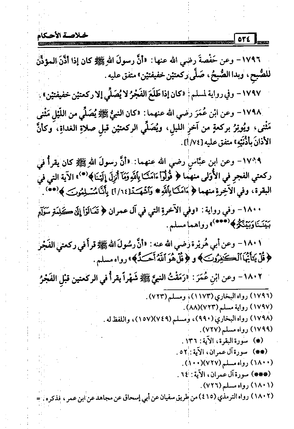 1797 - وَفِي رِوَايَة لمُسلم: " كَانَ إِذا طلع الْفجْر لَا يُصَلِّي إِلَّا رَكْعَتَيْنِ خفيفتين ".