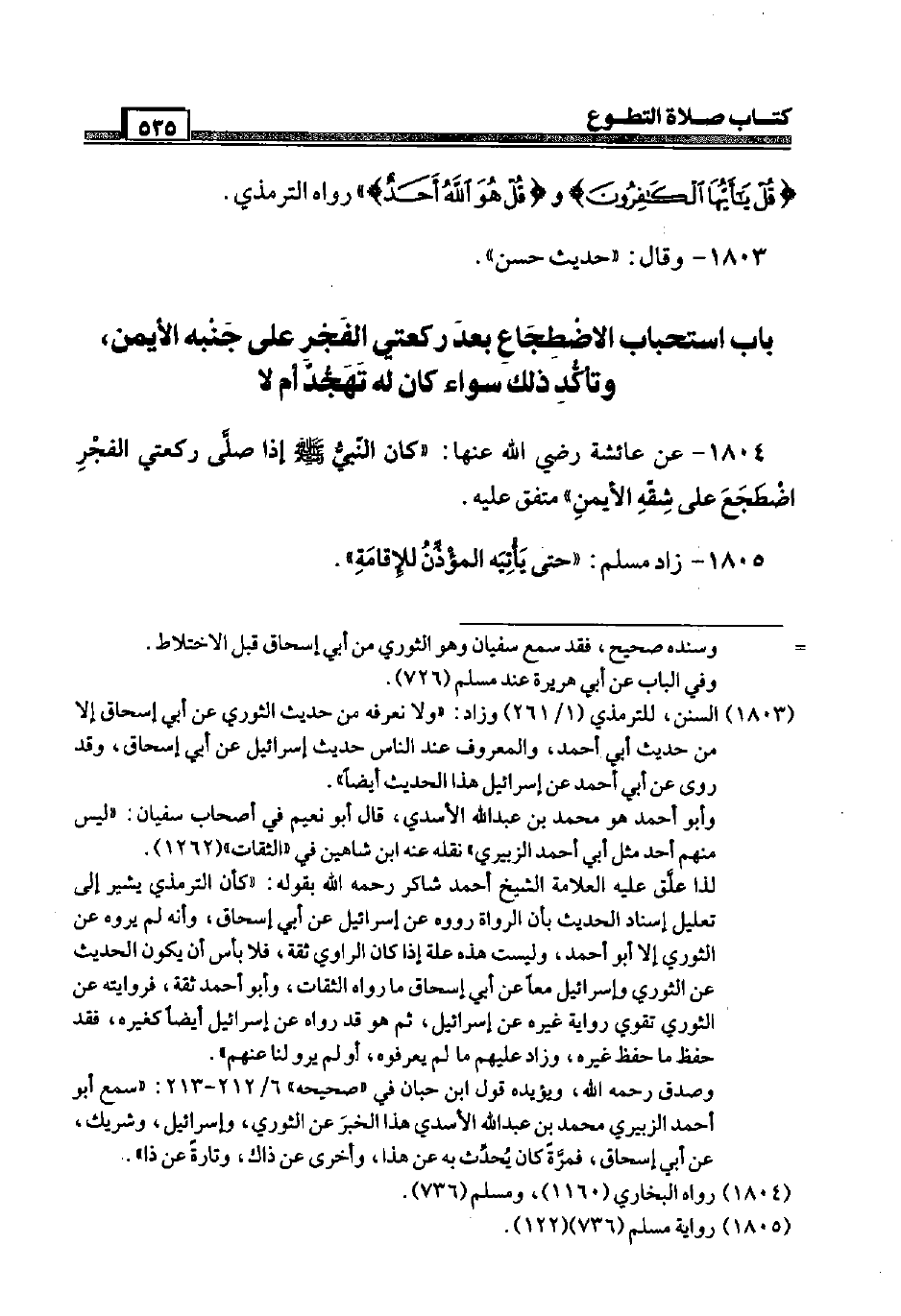 1804 - عَن عَائِشَة رَضِيَ اللَّهُ عَنْها: " كَانَ النَّبِي صَلَّى اللَّهُ عَلَيْهِ وَسَلَّم َ إِذا صَلَّى رَكْعَتي الْفجْر اضْطجع عَلَى شقَّه الْأَيْمن " مُتَّفق عَلَيْهِ.