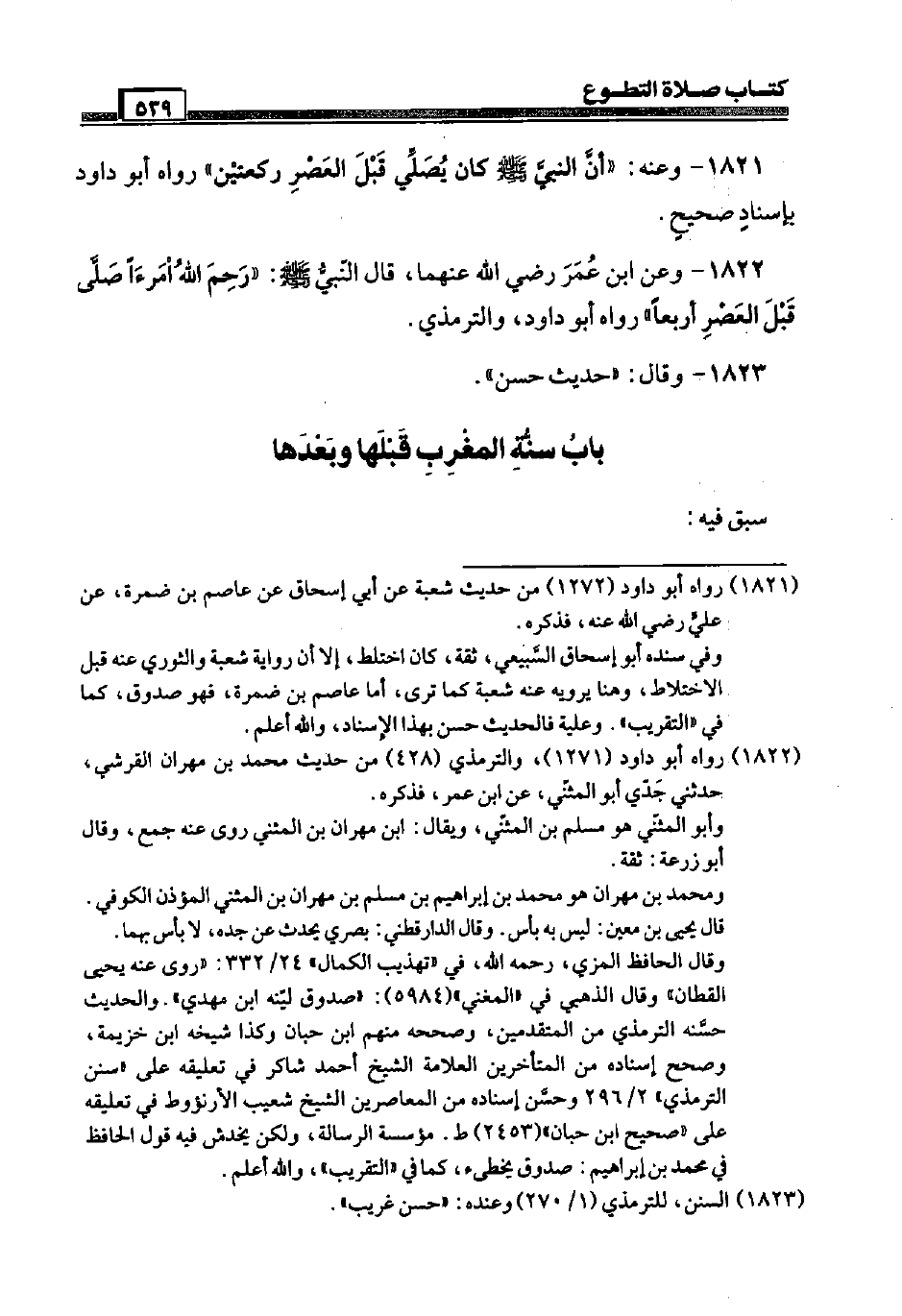 1822 - وَعَن ابْن عمر رَضِيَ اللَّهُ عَنْهما، قَالَ النَّبِي صَلَّى اللَّهُ عَلَيْهِ وَسَلَّم َ: " رحم الله امْرَءًا صَلَّى قبل الْعَصْر أَرْبعا " رَوَاهُ أَبُو دَاوُد، وَالتِّرْمِذِيّ.