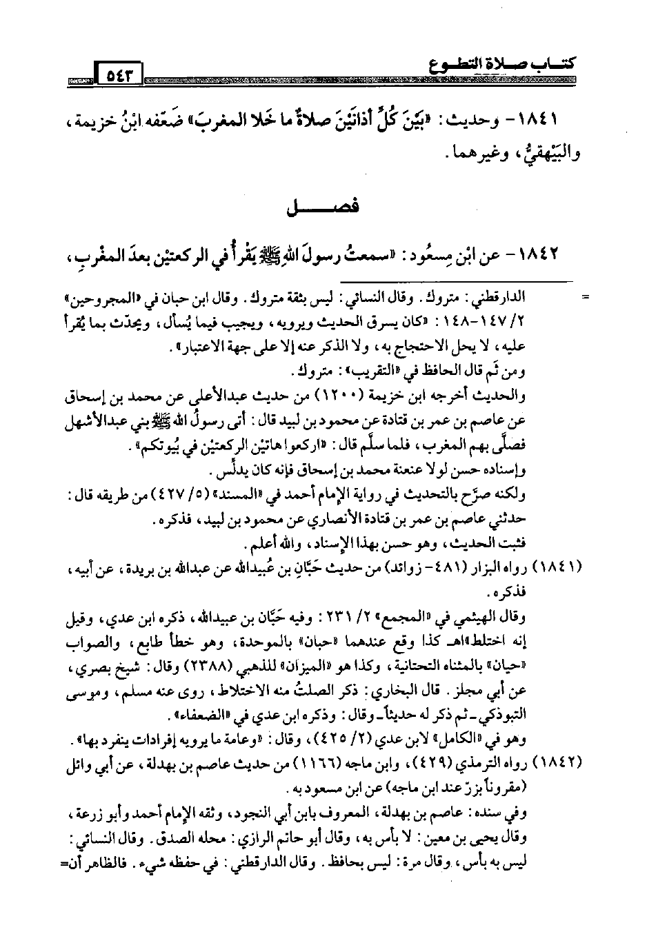 1841 - وَحَدِيث: " بَين كل أذانين صَلَاة مَا خلا الْمغرب " ضعفه ابْن خُزَيْمَة، وَالْبَيْهَقِيّ، وَغَيرهمَا.