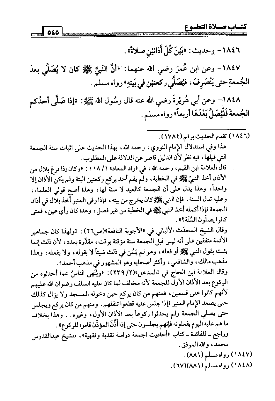 1847 - وَعَن ابْن عمر رَضِيَ اللَّهُ عَنْهما: " أَن النَّبِي صَلَّى اللَّهُ عَلَيْهِ وَسَلَّم َ كَانَ لَا يُصَلِّي بعد الْجُمُعَة حَتَّى ينْصَرف، فَيصَلي رَكْعَتَيْنِ فِي بَيته " رَوَاهُ مُسلم.