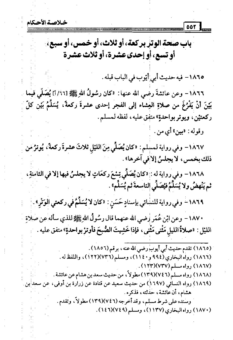 1870 - وَعَن ابْن عمر رَضِيَ اللَّهُ عَنْهما قَالَ رَسُول الله صَلَّى اللَّهُ عَلَيْهِ وَسَلَّم َ للَّذي سَأَلَهُ عَن صَلَاة اللَّيْل: " صَلَاة اللَّيْل مثنى مثنى، فَإِذا خشيت الصُّبْح فأوتر بِوَاحِدَة " مُتَّفق عَلَيْهِ.