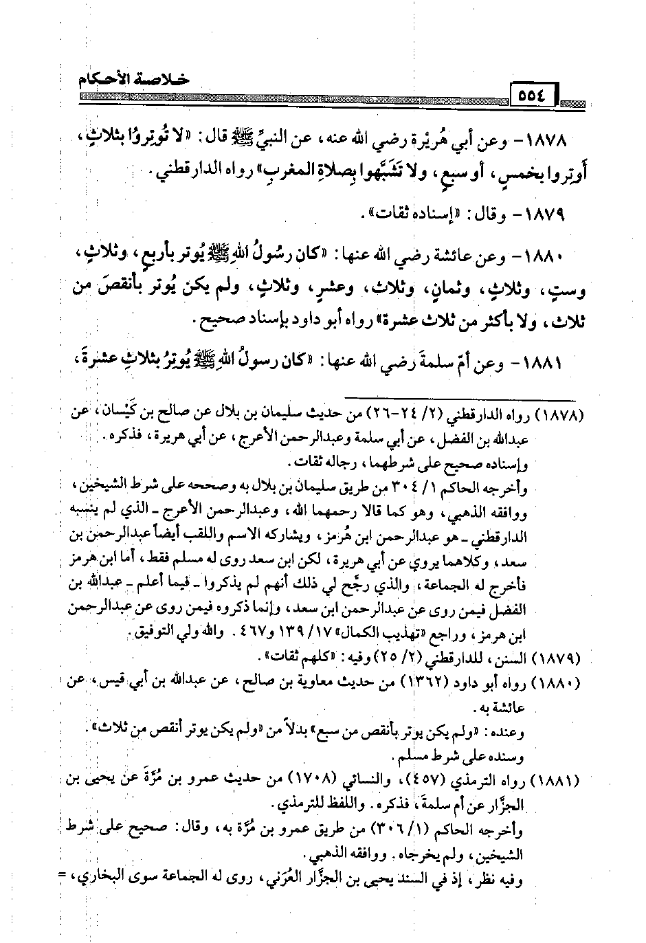1878 - وَعَن أبي هُرَيْرَة رَضِيَ اللَّهُ عَنْه، عَن النَّبِي صَلَّى اللَّهُ عَلَيْهِ وَسَلَّم َ قَالَ: " لَا توتروا بِثَلَاث، أوتروا بِخمْس، أَو سبع، وَلَا تشبهوا بِصَلَاة الْمغرب " رَوَاهُ الدَّارَقُطْنِيّ.