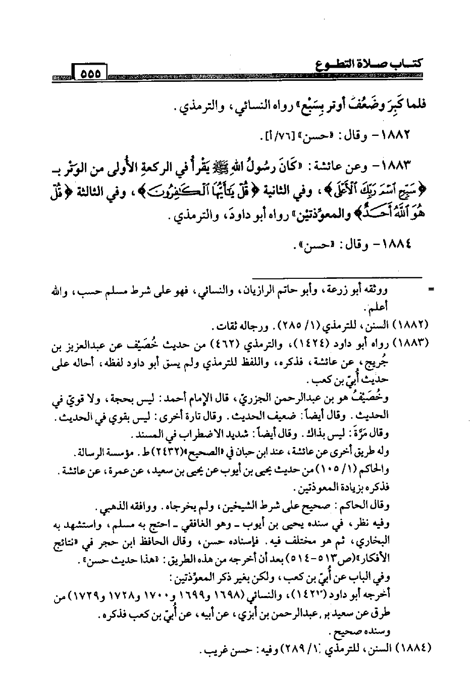 1883 - وَعَن عَائِشَة: " كَانَ رَسُول الله صَلَّى اللَّهُ عَلَيْهِ وَسَلَّم َ يقْرَأ فِي الرَّكْعَة الأولَى من الْوتر ب {سبح اسْم رَبك الْأَعْلَى} ، وَفِي الثَّانِيَة {قل يَا أَيهَا الْكَافِرُونَ} ، وَفِي الثَّالِثَة {قل هُوَ الله أحد} والمعوذتين " رَوَاهُ أَبُو دَاوُد، وَالتِّرْمِذِيّ.