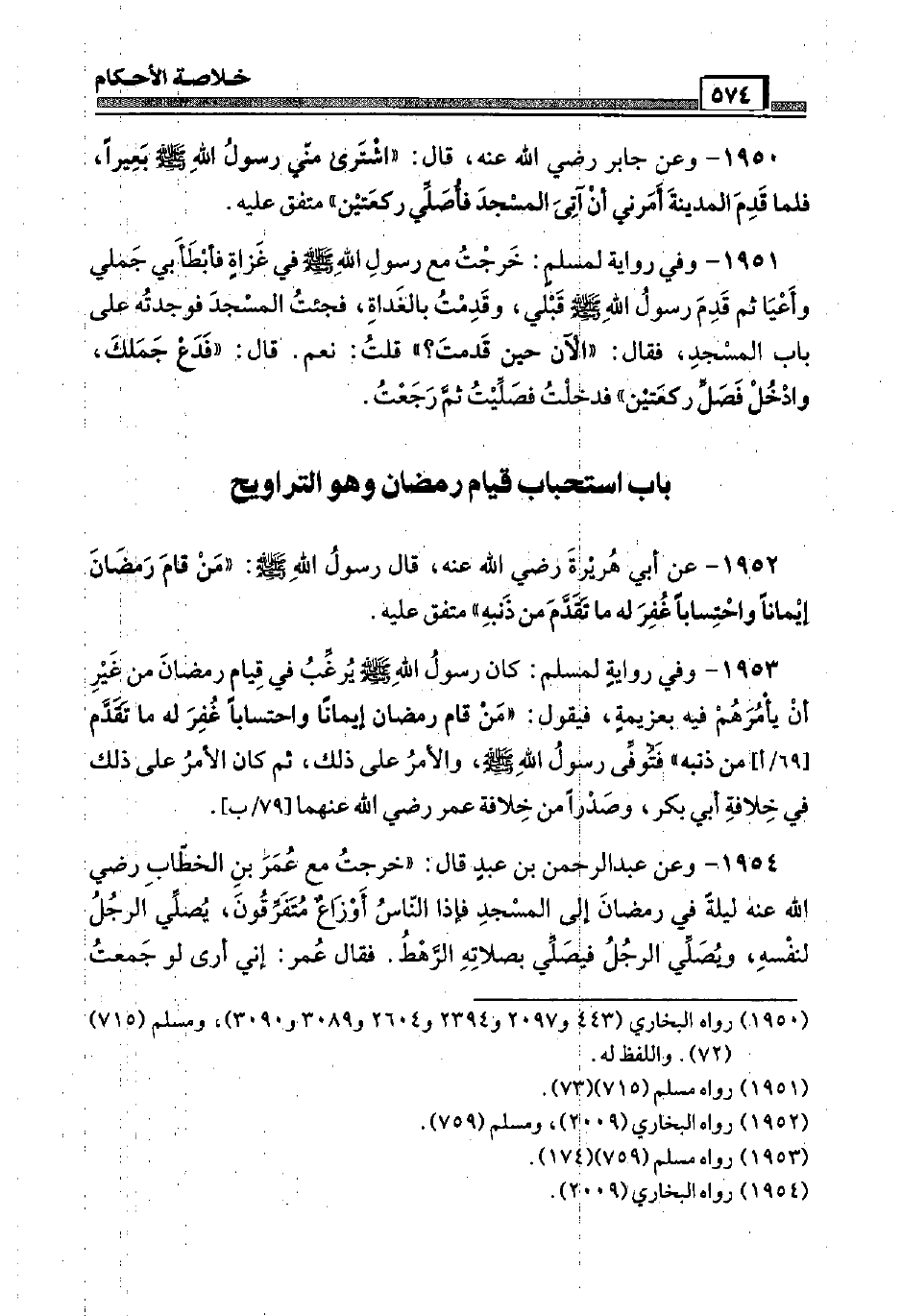 1952 - عَن أبي هُرَيْرَة رَضِيَ اللَّهُ عَنْه، قَالَ رَسُول الله صَلَّى اللَّهُ عَلَيْهِ وَسَلَّم َ: " من قَامَ رَمَضَان إِيمَانًا واحتسابا غفر لَهُ مَا تقدم من ذَنبه " مُتَّفق عَلَيْهِ.