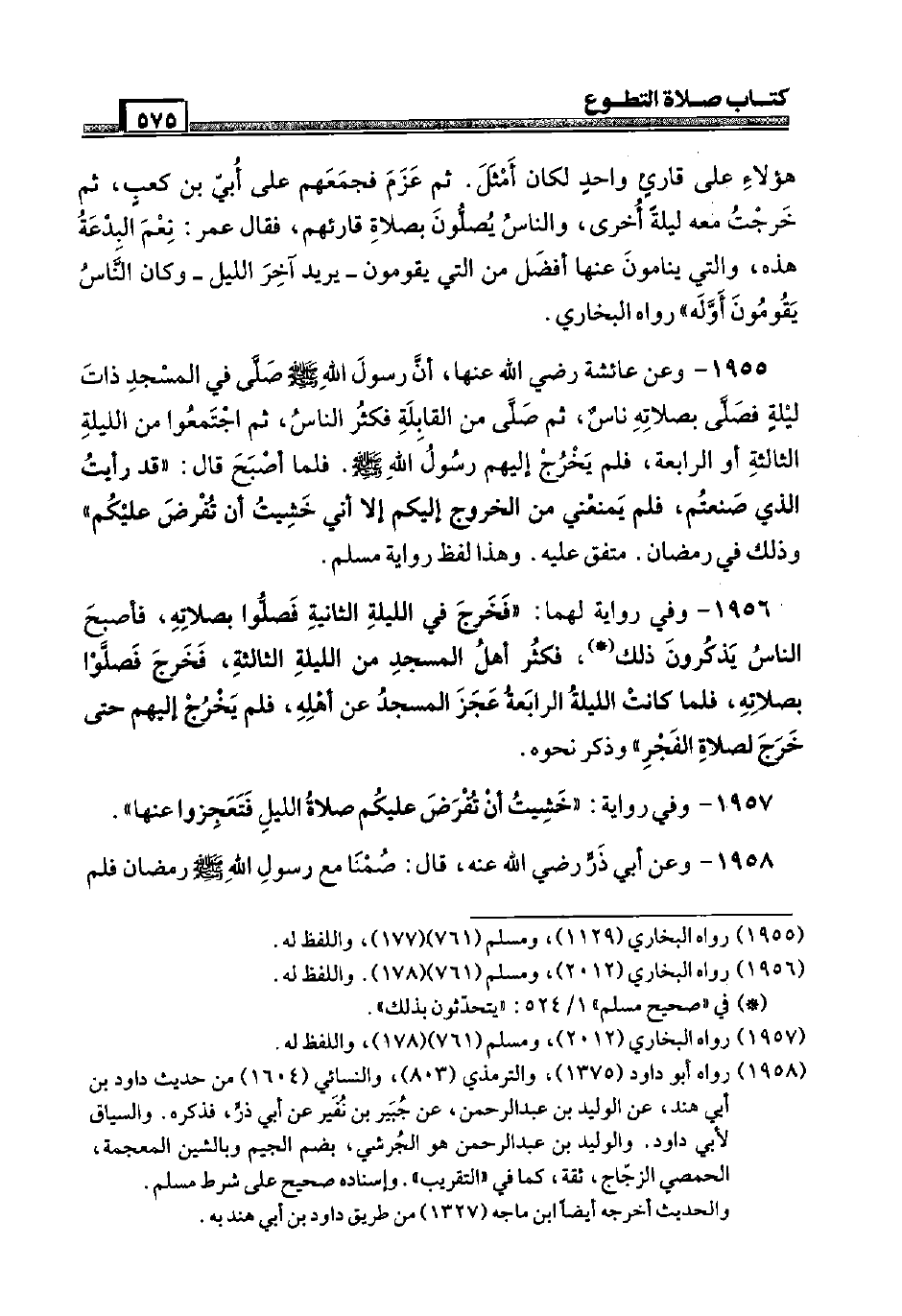 1955 - وَعَن عَائِشَة رَضِيَ اللَّهُ عَنْها، أَن رَسُول الله صَلَّى اللَّهُ عَلَيْهِ وَسَلَّم َ صَلَّى فِي الْمَسْجِد ذَات لَيْلَة فَصَلى بِصَلَاتِهِ نَاس، ثمَّ صَلَّى من الْقَابِلَة فَكثر النَّاس، ثمَّ اجْتَمعُوا من اللَّيْلَة الثَّالِثَة أَو الرَّابِعَة، فَلم يخرج إِلَيْهِم رَسُول الله صَلَّى اللَّهُ عَلَيْهِ وَسَلَّم َ. فَلَمَّا أصبح قَالَ: " قد رَأَيْت الَّذِي صَنَعْتُم، فَلم يَمْنعنِي من الْخُرُوج إِلَيْكُم إِلَّا أَنِّي خشيت أَن تفرض عَلَيْكُم " وَذَلِكَ فِي رَمَضَان. مُتَّفق عَلَيْهِ. وَهَذَا لفظ رِوَايَة مُسلم.