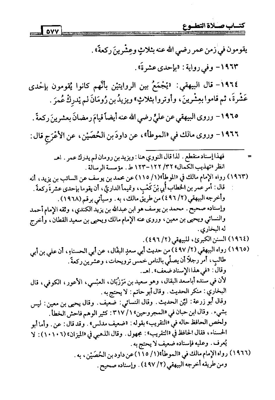 1964 - قَالَ الْبَيْهَقِيّ: " يجمع بَين الرِّوَايَتَيْنِ بِأَنَّهُم كَانُوا يقومُونَ بِإِحْدَى عشرَة، ثمَّ قَامُوا بِعشْرين، وأوتروا بِثَلَاث " وَيزِيد بن رُومَان لم يدْرك عمر.