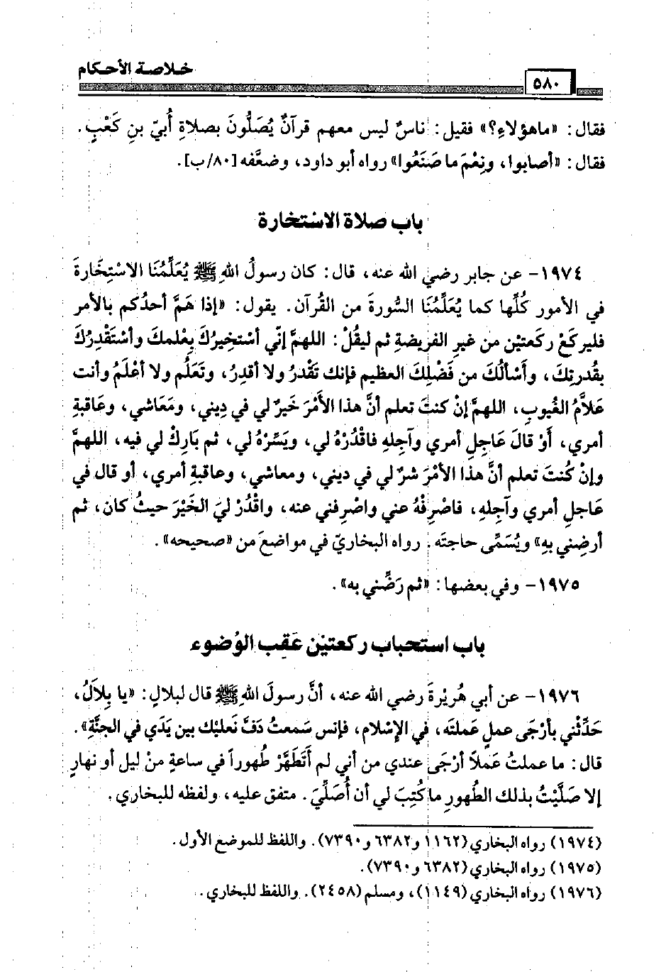 1974 - عَن جَابر رَضِيَ اللَّهُ عَنْه، قَالَ: كَانَ رَسُول الله صَلَّى اللَّهُ عَلَيْهِ وَسَلَّم َ يعلمنَا الاستخارة فِي الْأُمُور كلهَا كَمَا يعلمنَا السُّورَة من الْقُرْآن. يَقُول: " إِذا همّ أحدكُم بِالْأَمر فليركع رَكْعَتَيْنِ من غير الْفَرِيضَة ثمَّ ليقل: اللَّهُمَّ إِنِّي أستخيرك بعلمك وأستقدرك بقدرتك، وَأَسْأَلك من فضلك الْعَظِيم فَإنَّك تقدر وَلَا أقدر، وَتعلم وَلَا أعلم وَأَنت علام الغيوب، اللَّهُمَّ إِن كنت تعلم أَن هَذَا الْأَمر خير لي فِي ديني، ومعاشي، وعاقبة أَمْرِي، أَو قَالَ عَاجل أَمْرِي وآجله فاقدره لي، ويسره لي، ثمَّ بَارك لي فِيهِ، اللَّهُمَّ وَإِن كنت تعلم أَن هَذَا الْأَمر شَرّ لي فِي ديني، ومعاشي، وعاقبة أَمْرِي، أَو قَالَ فِي عَاجل أَمْرِي وآجله، فاصرفه عني واصرفني عَنهُ، واقدر لي الْخَيْر حَيْثُ كَانَ ثمَّ أرضني بِهِ " ويسمي حَاجته. رَوَاهُ البُخَارِيّ فِي مَوَاضِع من " صَحِيحه ".