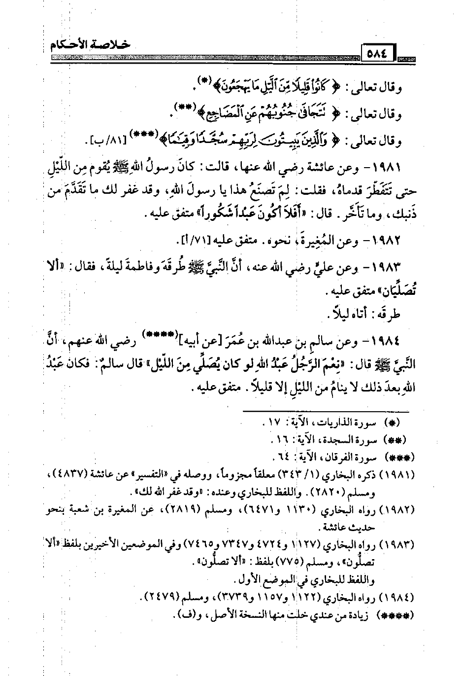 1983 - وَعَن عَلّي رَضِيَ اللَّهُ عَنْه، أَن النَّبِي صَلَّى اللَّهُ عَلَيْهِ وَسَلَّم َ طرقه وَفَاطِمَة لَيْلَة، فَقَالَ: " أَلا تصليان " مُتَّفق عَلَيْهِ. طرقه: أَتَاهُ لَيْلًا.