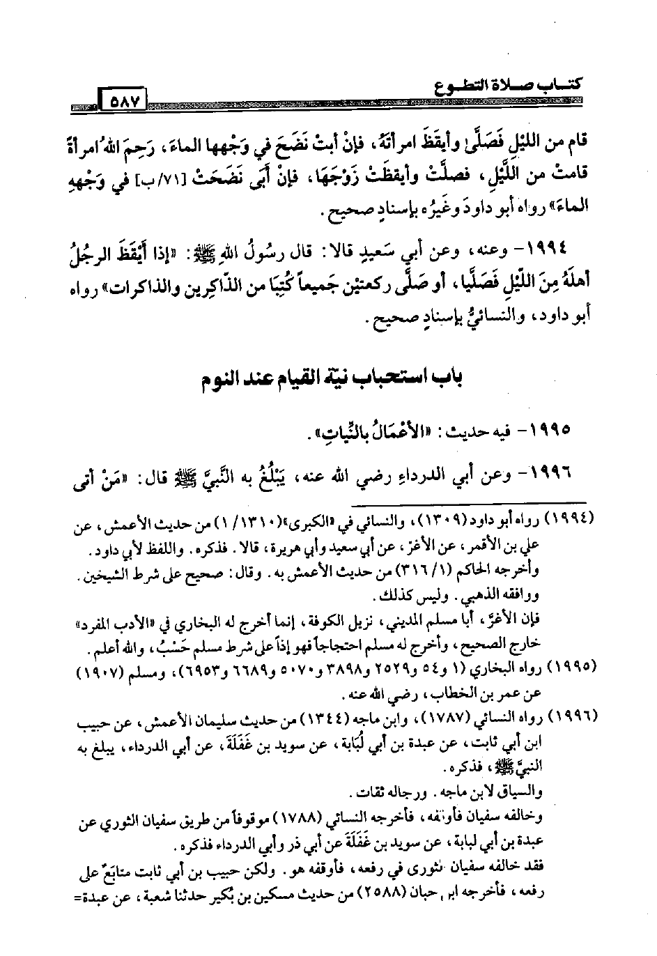 قَامَ من اللَّيْل فَصَلى وَأَيْقَظَ امْرَأَته، فَإِن أَبَت نضح فِي وَجههَا المَاء، رحم الله امْرَأَة قَامَت من اللَّيْل، فصلت وأيقظت زَوجهَا، فَإِن أَبَى نضحت [71 / ب] فِي وَجهه المَاء " رَوَاهُ أَبُو دَاوُد وَغَيره بِإِسْنَاد صَحِيح.