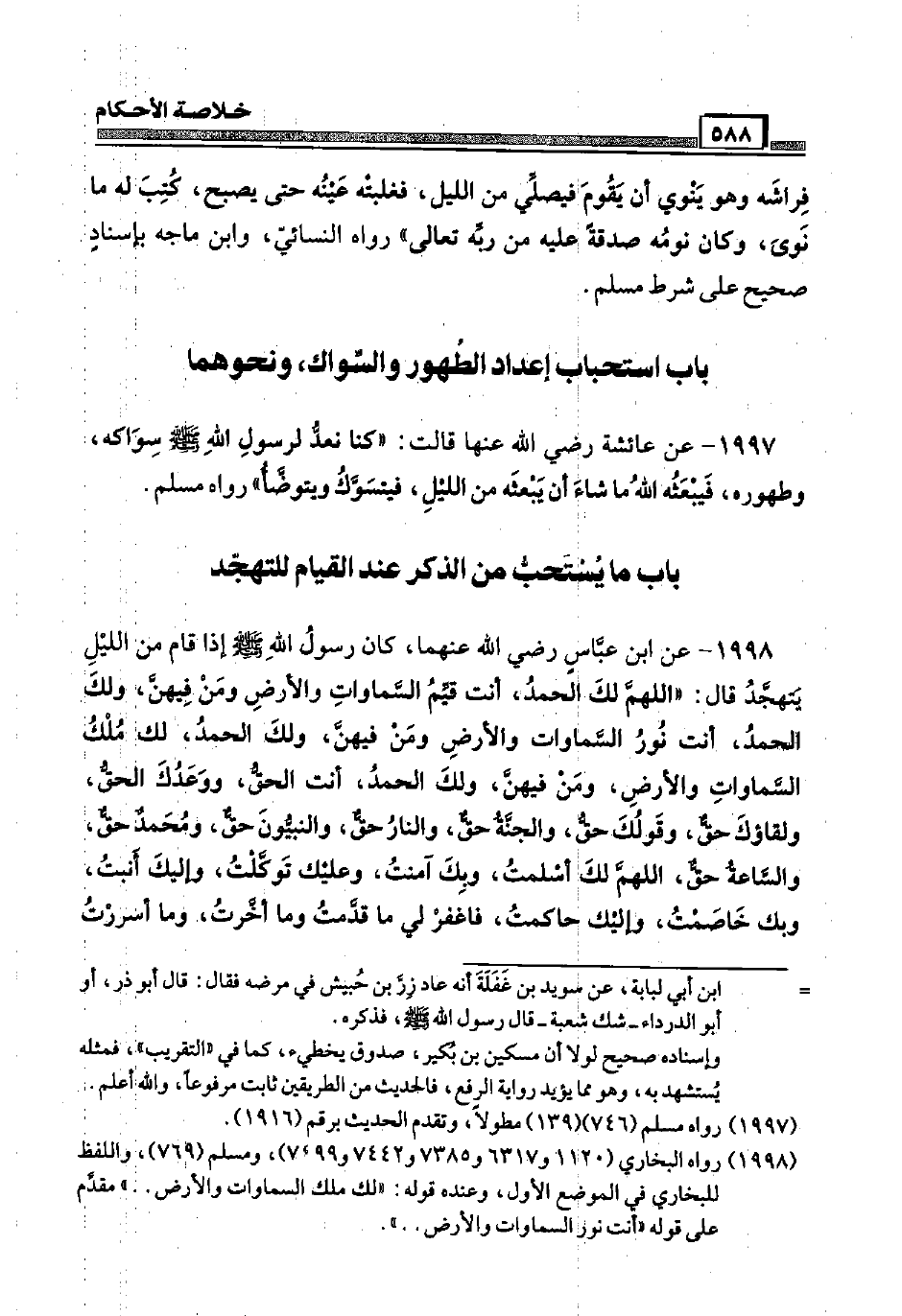 1998 - عَن ابْن عَبَّاس رَضِيَ اللَّهُ عَنْهما، كَانَ رَسُول الله صَلَّى اللَّهُ عَلَيْهِ وَسَلَّم َ إِذا قَامَ من اللَّيْل يتهجد قَالَ: " اللَّهُمَّ لَك الْحَمد، أَنْت قيم السَّمَاوَات وَالْأَرْض وَمن فِيهِنَّ، وَلَك الْحَمد، أَنْت نور السَّمَاوَات وَالْأَرْض وَمن فِيهِنَّ، وَلَك الْحَمد، لَك ملك السَّمَاوَات وَالْأَرْض، وَمن فِيهِنَّ، وَلَك الْحَمد، أَنْت الْحق، وَوَعدك الْحق، ولقاؤك حق، وقولك حق، وَالْجنَّة حق، وَالنَّار حق، والنبيون حق، وَمُحَمّد حق، والساعة حق، اللَّهُمَّ لَك أسلمت، وَبِك آمَنت، وَعَلَيْك توكلت، وَإِلَيْك أنبت، وَبِك خَاصَمت، وَإِلَيْك حاكمت، فَاغْفِر لي مَا قدمت وَمَا أخرت، وَمَا أسررت