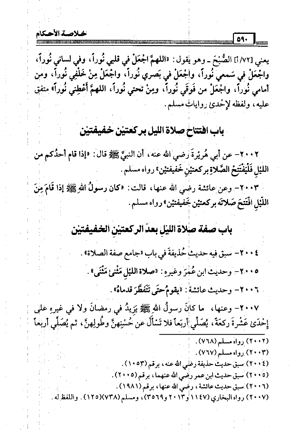 2002 - عَن أبي هُرَيْرَة رَضِيَ اللَّهُ عَنْه، أَن النَّبِي صَلَّى اللَّهُ عَلَيْهِ وَسَلَّم َ قَالَ: " إِذا قَامَ أحدكُم من اللَّيْل فليفتتح الصَّلَاة بِرَكْعَتَيْنِ خفيفتين " رَوَاهُ مُسلم.