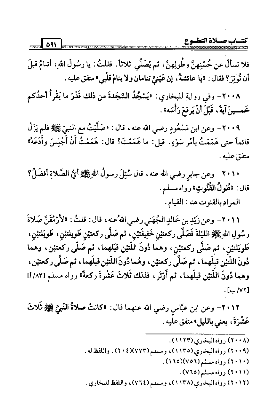 2012 - وَعَن ابْن عَبَّاس رَضِيَ اللَّهُ عَنْهما قَالَ: " كَانَت صَلَاة النَّبِي صَلَّى اللَّهُ عَلَيْهِ وَسَلَّم َ ثَلَاث عشرَة، يَعْنِي بِاللَّيْلِ " مُتَّفق عَلَيْهِ.