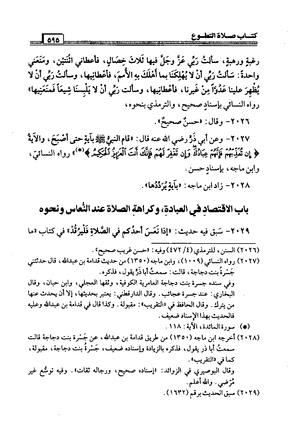 2027 - وَعَن أبي ذَر رَضِيَ اللَّهُ عَنْه قَالَ: " قَامَ النَّبِي صَلَّى اللَّهُ عَلَيْهِ وَسَلَّم َ بِآيَة حَتَّى أصبح، وَالْآيَة {إِن تُعَذبهُمْ فَإِنَّهُم عِبَادك وَإِن تغْفر لَهُم فَإنَّك أَنْت الْعَزِيز الْحَكِيم} " رَوَاهُ النَّسَائِيّ، وَابْن مَاجَه، بِإِسْنَاد حسن.
