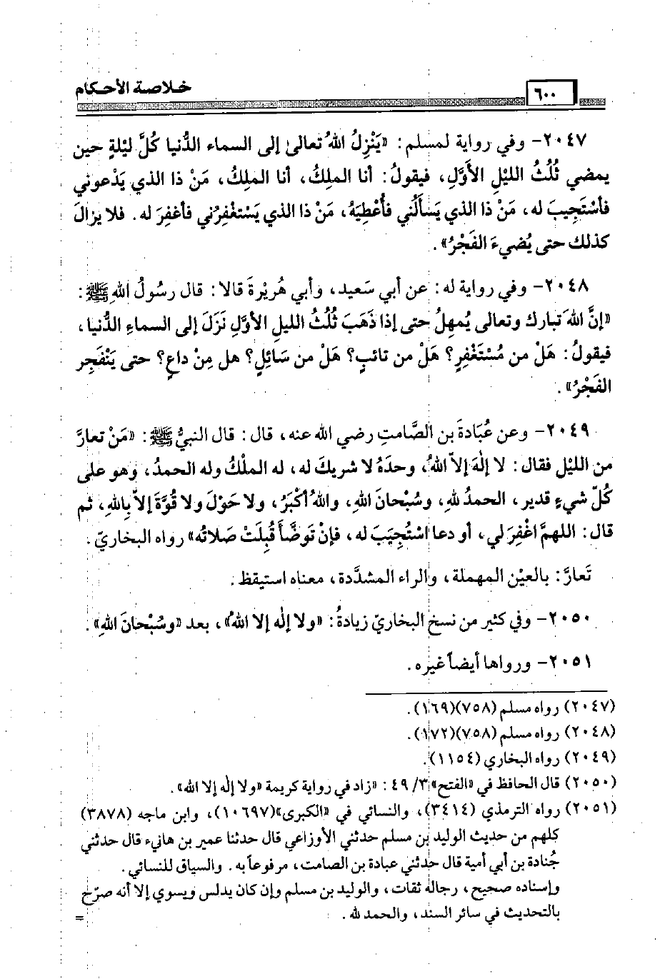 2049 - وَعَن عبَادَة بن الصَّامِت رَضِيَ اللَّهُ عَنْه، قَالَ: قَالَ النَّبِي صَلَّى اللَّهُ عَلَيْهِ وَسَلَّم َ: " من تعار من اللَّيْل فَقَالَ: لَا إِلَه إِلَّا الله، وَحده لَا شريك لَهُ، لَهُ الْملك وَله الْحَمد، وَهُوَ عَلَى كل شَيْء قدير، الْحَمد لله، وَسُبْحَان الله، وَالله أكبر، وَلَا حول وَلَا قُوَّة إِلَّا بِاللَّه، ثمَّ قَالَ: اللَّهُمَّ اغْفِر لي، أَو دَعَا استُجيب لَهُ، فَإِن تَوَضَّأ قبلت صلَاته " رَوَاهُ البُخَارِيّ. تعار: بِالْعينِ الْمُهْملَة، وَالرَّاء الْمُشَدّدَة، مَعْنَاهُ اسْتَيْقَظَ.