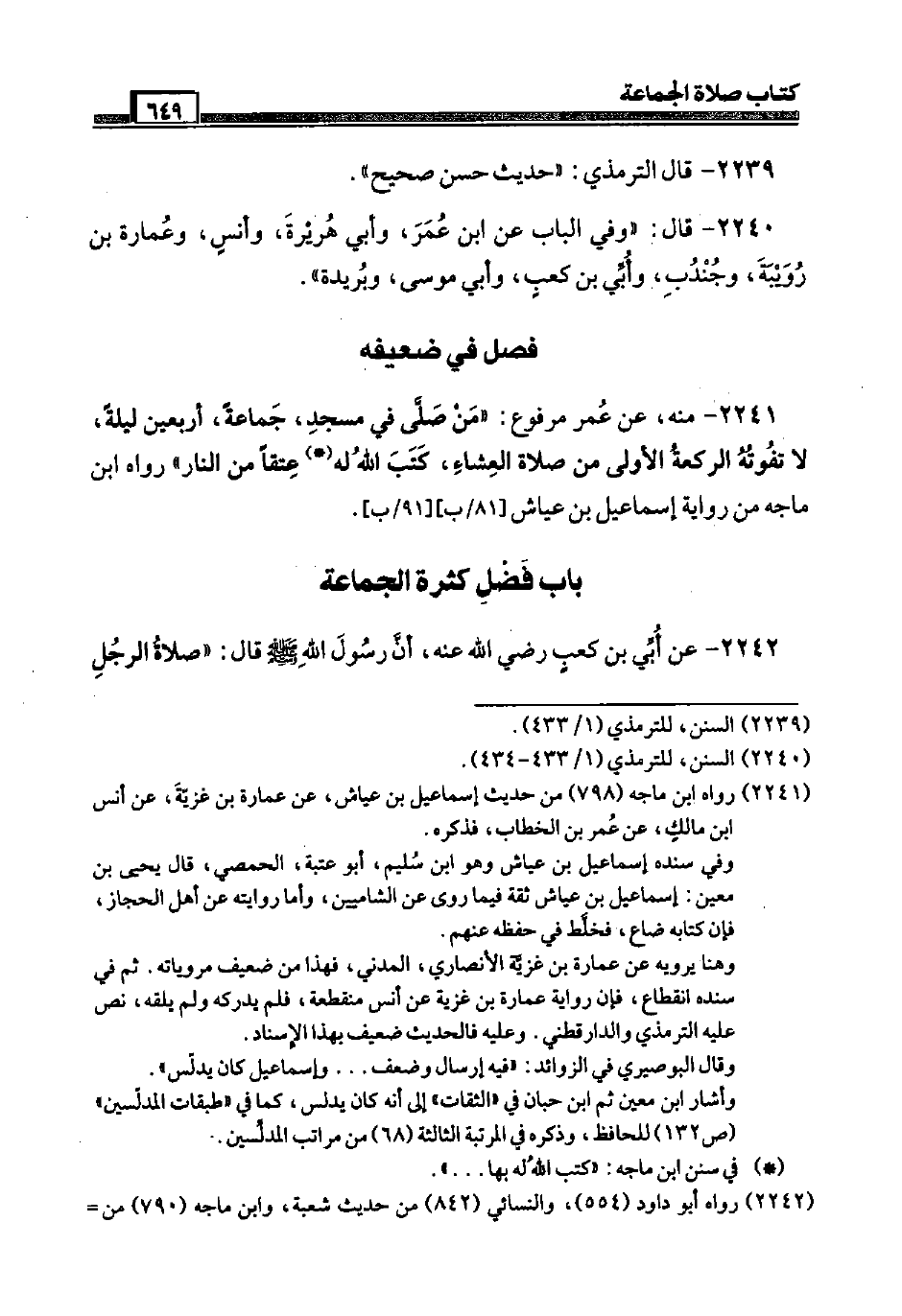 2241 - مِنْهُ، عَن عمر مَرْفُوع: " من صَلَّى فِي مَسْجِد، جمَاعَة، أَرْبَعِينَ لَيْلَة، لَا تفوته الرَّكْعَة الأولَى من صَلَاة الْعشَاء، كتب الله لَهُ عتقا من النَّار " رَوَاهُ ابْن ماجة من رِوَايَة إِسْمَاعِيل بن عَيَّاش [81 / ب] [91 / ب] .