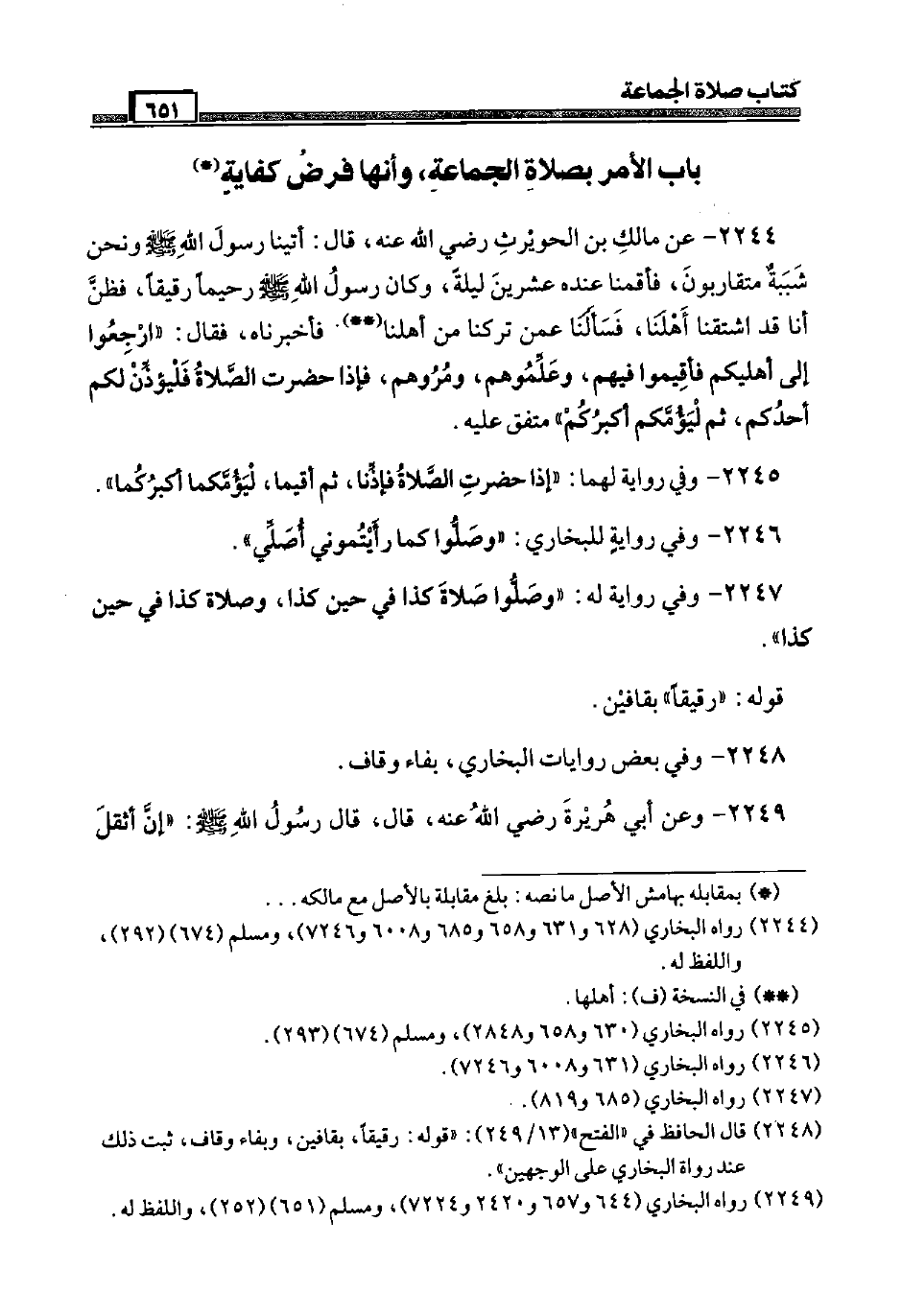 2246 - وَفِي رِوَايَة للْبُخَارِيّ: " وصلوا كَمَا رَأَيْتُمُونِي أُصَلِّي ".