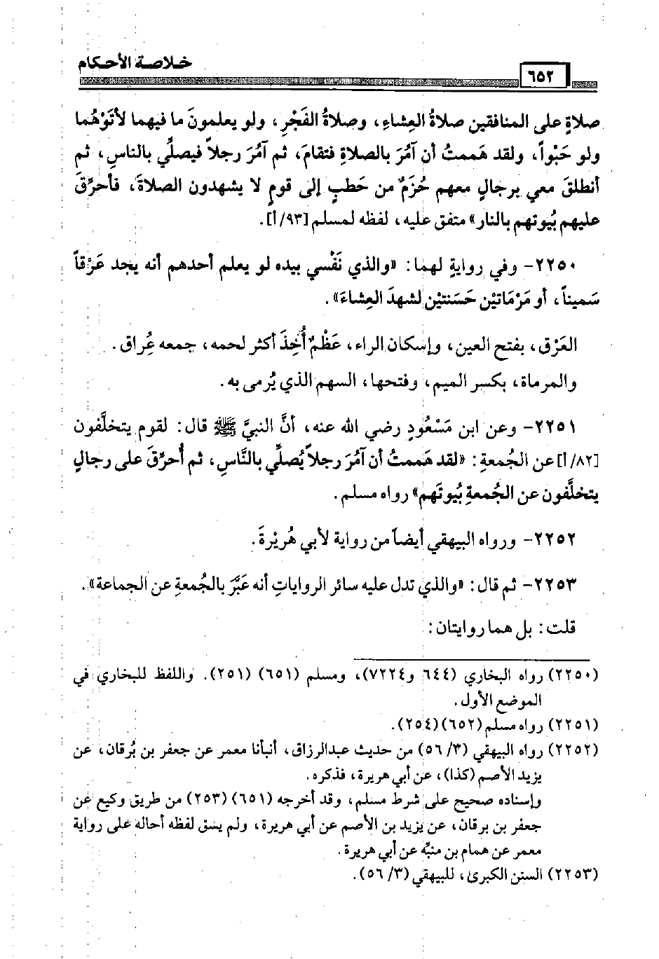 2251 - وَعَن ابْن مَسْعُود رَضِيَ اللَّهُ عَنْه، أَن النَّبِي صَلَّى اللَّهُ عَلَيْهِ وَسَلَّم َ قَالَ: لقوم يتخلفون [82 / أ] عَن الْجُمُعَة: " لقد هَمَمْت أَن آمُر رجلا يُصَلِّي بِالنَّاسِ، ثمَّ أحرق عَلَى رجال يتخلفون عَن الْجُمُعَة بُيُوتهم " رَوَاهُ مُسلم.