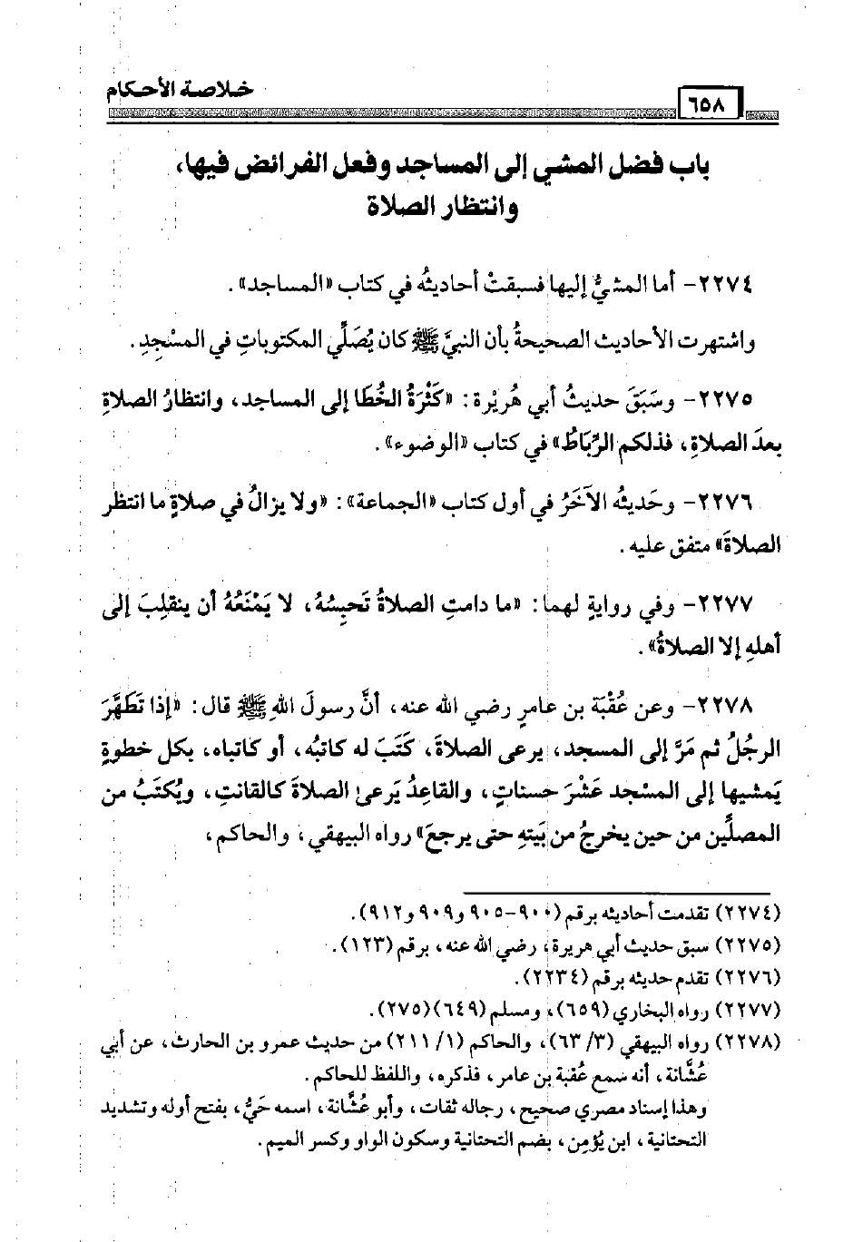 2278 - وَعَن عقبَة بن عَامر رَضِيَ اللَّهُ عَنْه، أَن رَسُول الله صَلَّى اللَّهُ عَلَيْهِ وَسَلَّم َ قَالَ: " إِذا تطهر الرجل ثمَّ مر إِلَى الْمَسْجِد، يرْعَى الصَّلَاة، كتب لَهُ كَاتبه، أَو كاتباه، بِكُل خطْوَة يمشيها إِلَى الْمَسْجِد عشر حَسَنَات، والقاعد يرْعَى الصَّلَاة كالقانت، وَيكْتب من الْمُصَلِّين من حِين يخرج من بَيته حَتَّى يرجع " رَوَاهُ الْبَيْهَقِيّ، وَالْحَاكِم،