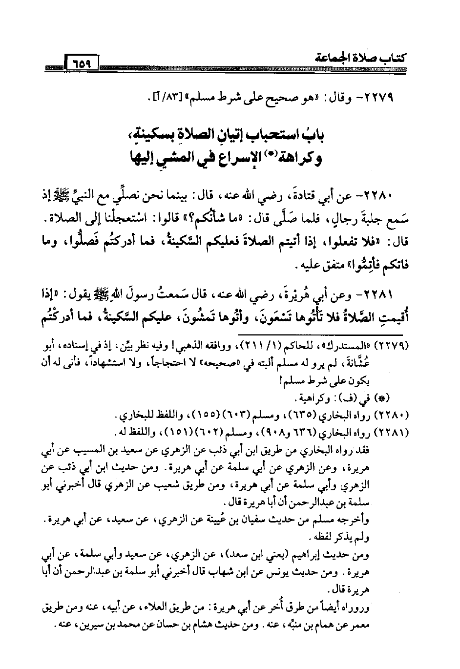 2280 - عَن أبي قَتَادَة، رَضِيَ اللَّهُ عَنْه، قَالَ: بَيْنَمَا نَحن نصلي مَعَ النَّبِي صَلَّى اللَّهُ عَلَيْهِ وَسَلَّم َ إِذْ سمع جلبة رجال،، فَلَمَّا صَلَّى قَالَ: " مَا شَأْنكُمْ؟ " قَالُوا: استعجلنا إِلَى الصَّلَاة. قَالَ: " فَلَا تَفعلُوا، إِذا أتيتم الصَّلَاة فَعَلَيْكُم السكينَة، فَمَا أدركتم فصلوا، وَمَا فاتكم فَأتمُّوا " مُتَّفق عَلَيْهِ.