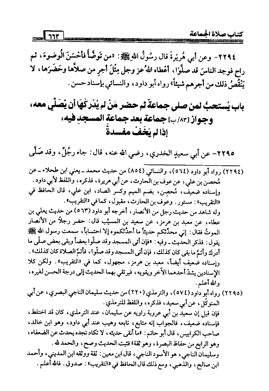 2294 - وَعَن أبي هُرَيْرَة قَالَ رَسُول الله صَلَّى اللَّهُ عَلَيْهِ وَسَلَّم َ: " من تَوَضَّأ فَأحْسن الْوضُوء، ثمَّ رَاح فَوجدَ النَّاس قد صلوا، أعطَاهُ الله عَزَّ وَجَلَّ مثل أجر من صلاهَا وحضرها، لَا ينقص ذَلِك من أجرهم شَيْئا " رَوَاهُ أَبُو دَاوُد، وَالنَّسَائِيّ بِإِسْنَاد حسن.