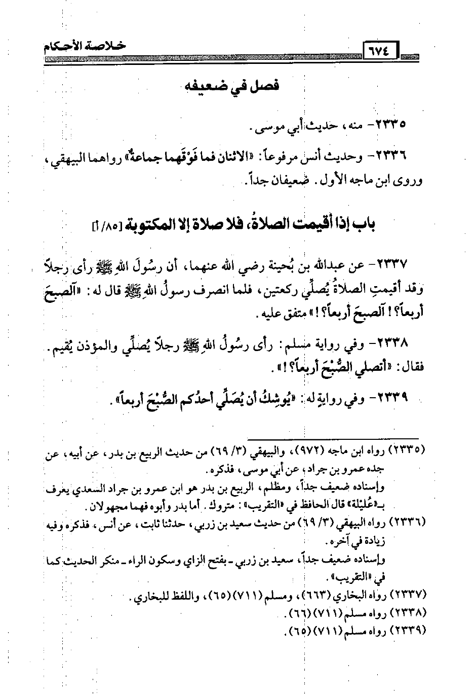 2337 - عَن عبد الله بن بُحينة رَضِيَ اللَّهُ عَنْهما، أَن رَسُول الله صَلَّى اللَّهُ عَلَيْهِ وَسَلَّم َ رَأَى رجلا وَقد أُقِيمَت الصَّلَاة يُصَلِّي رَكْعَتَيْنِ، فَلَمَّا انْصَرف رَسُول الله صَلَّى اللَّهُ عَلَيْهِ وَسَلَّم َ قَالَ لَهُ: " آلصبح أَرْبعا؟ ! آلصبح أَرْبعا؟ ! " مُتَّفق عَلَيْهِ.