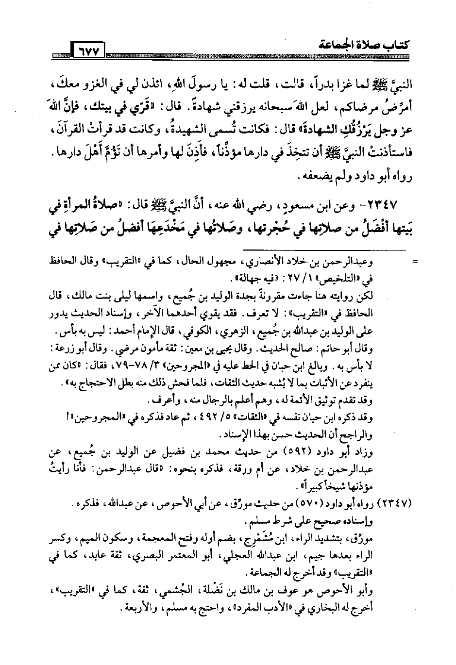 2347 - وَعَن ابْن مَسْعُود، رَضِيَ اللَّهُ عَنْه، أَن النَّبِي صَلَّى اللَّهُ عَلَيْهِ وَسَلَّم َ قَالَ: " صَلَاة الْمَرْأَة فِي بَيتهَا أفضل من صلَاتهَا فِي حُجْرَتهَا، وصلاتها فِي مخدعها أفضل من صلَاتهَا فِي