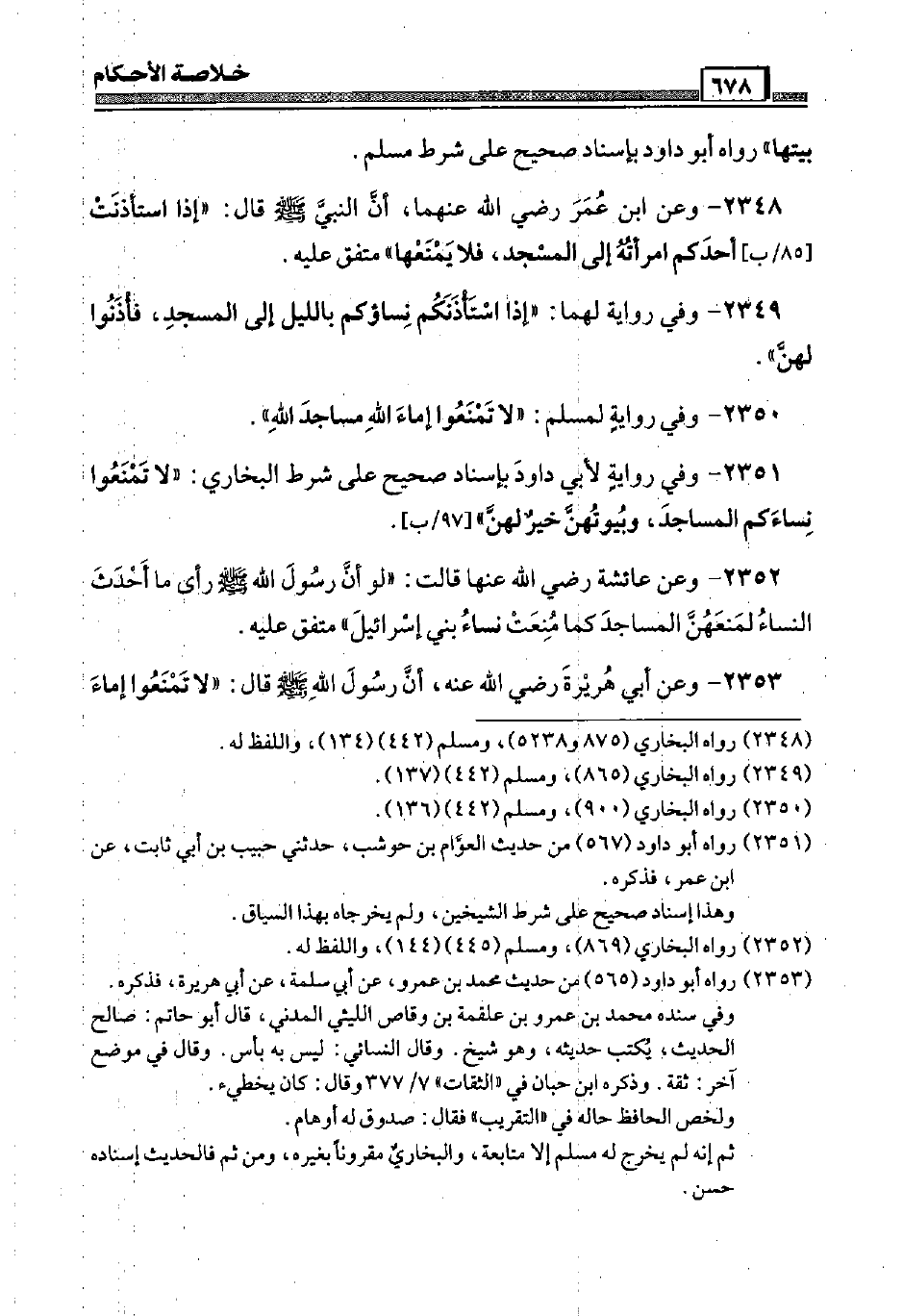 2351 - وَفِي رِوَايَة لأبي دَاوُد بِإِسْنَاد صَحِيح عَلَى شَرط البُخَارِيّ: " لَا تمنعوا نساءكم الْمَسَاجِد، وبيوتهن خير لَهُنَّ " [97 / ب] .