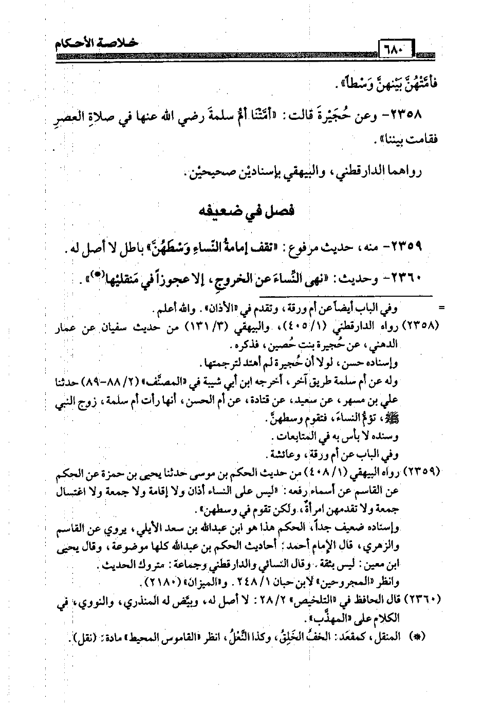 2358 - وَعَن حجيرة قَالَت: " أمَّتْنا أم سَلمَة رَضِيَ اللَّهُ عَنْها فِي صَلَاة الْعَصْر فَقَامَتْ بَيْننَا ". رَوَاهُمَا الدَّارَقُطْنِيّ، وَالْبَيْهَقِيّ بِإِسْنَادَيْنِ صَحِيحَيْنِ.