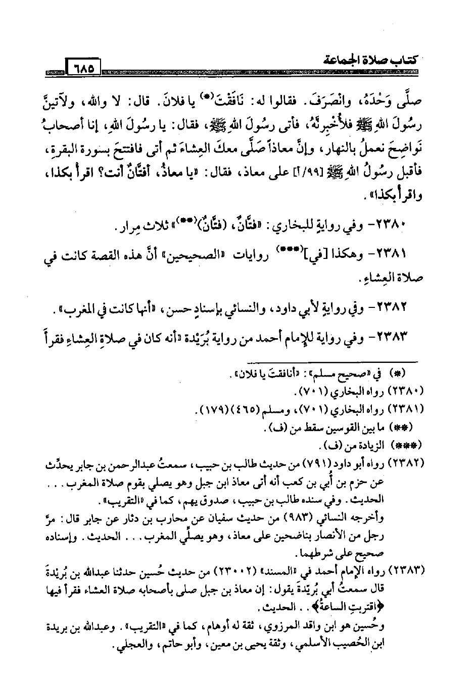 صَلَّى وَحده، وَانْصَرف. فَقَالُوا لَهُ: نافقت يَا فلَان. قَالَ: لَا وَالله، ولآتينَّ رَسُول الله صَلَّى اللَّهُ عَلَيْهِ وَسَلَّم َ فلأخبرنه، فَأَتَى رَسُول الله صَلَّى اللَّهُ عَلَيْهِ وَسَلَّم َ، فَقَالَ: يَا رَسُول الله، إِنَّا أَصْحَاب نواضح نعمل بِالنَّهَارِ، وَإِن معَاذًا صَلَّى مَعَك الْعشَاء ثمَّ أَتَى فَافْتتحَ بِسُورَة الْبَقَرَة، فَأقبل رَسُول الله صَلَّى اللَّهُ عَلَيْهِ وَسَلَّم َ [99 / أ] عَلَى معَاذ، فَقَالَ: " يَا معَاذ، أفتَّان أَنْت؟ اقْرَأ بِكَذَا، واقرأ بِكَذَا ".