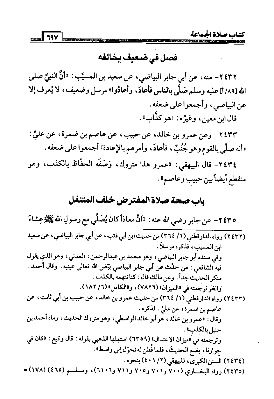 2433 - وَعَن عَمْرو بن خَالِد، عَن حبيب، عَن عَاصِم بن ضَمرَة، عَن عَلّي: " أَنه صَلَّى بالقوم وَهُوَ جنب، فَأَعَادَ، وَأمرهمْ بِالْإِعَادَةِ " أَجمعُوا عَلَى ضعفه.