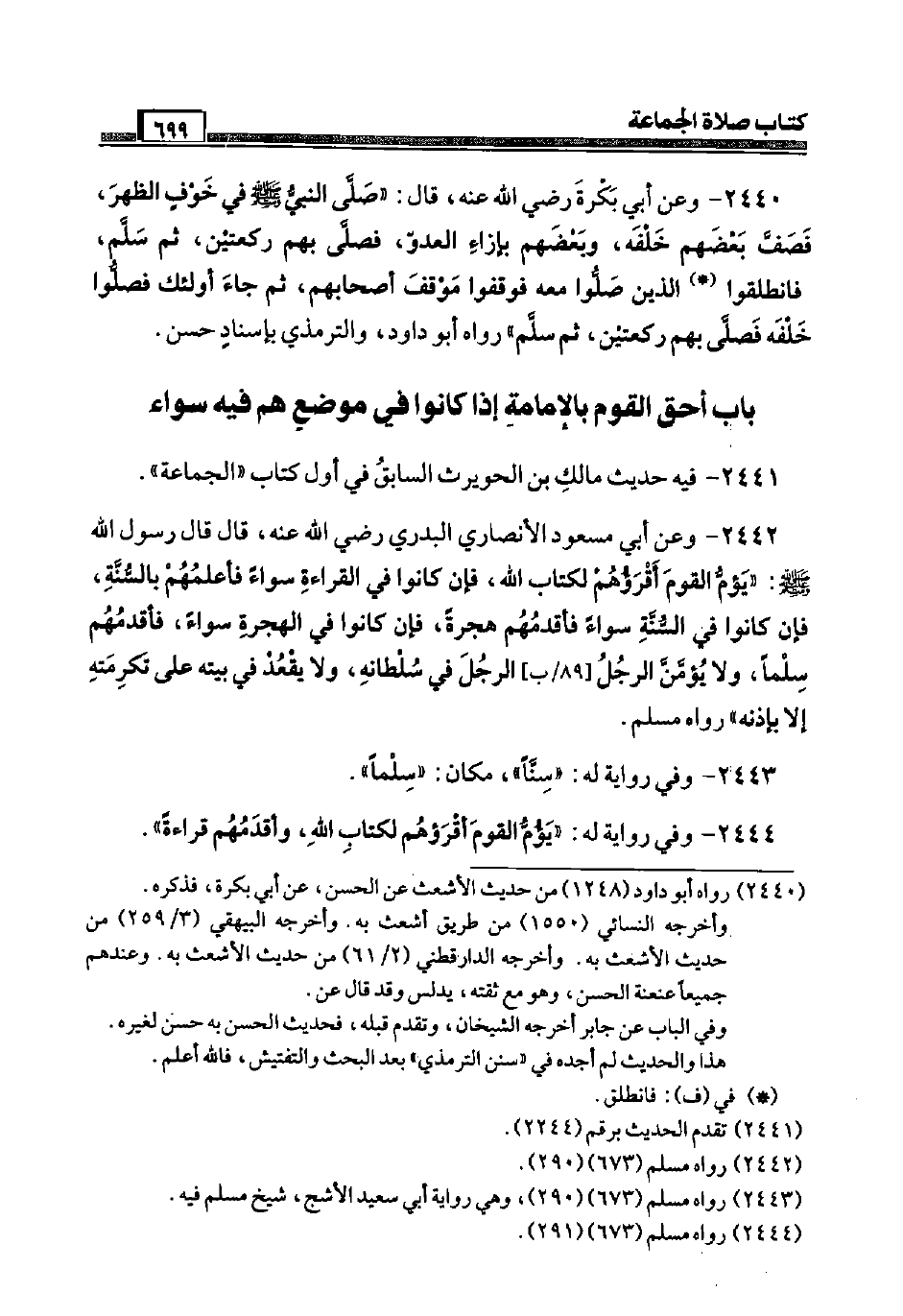 2442 - وَعَن أبي مَسْعُود الْأنْصَارِيّ البدري رَضِيَ اللَّهُ عَنْه، قَالَ قَالَ رَسُول الله صَلَّى اللَّهُ عَلَيْهِ وَسَلَّم َ: " يؤم الْقَوْم أقرؤهم لكتاب الله، فَإِن كَانُوا فِي الْقِرَاءَة سَوَاء فأعلمهم بِالسنةِ، فَإِن كَانُوا فِي السّنة سَوَاء فأقدمهم هِجْرَة، فَإِن كَانُوا فِي الْهِجْرَة سَوَاء، فأقدمهم سلما، وَلَا يؤمَّنَّ الرجل [89 / ب] الرجل فِي سُلْطَانه، وَلَا يقْعد فِي بَيته عَلَى تكرمته إِلَّا بِإِذْنِهِ " رَوَاهُ مُسلم.