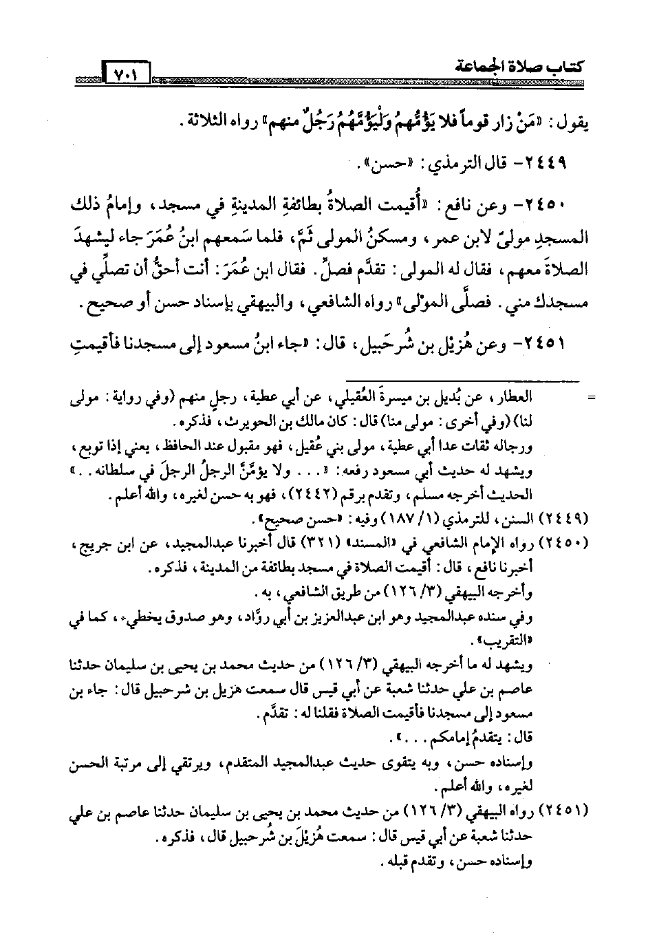 2450 - وَعَن نَافِع: " أُقِيمَت الصَّلَاة بطَائفَة الْمَدِينَة فِي مَسْجِد، وَإِمَام ذَلِك الْمَسْجِد مولَى لِابْنِ عمر، ومسكن الْمولى ثمَّ، فَلَمَّا سمعهم ابْن عمر جَاءَ ليشهد الصَّلَاة مَعَهم، فَقَالَ لَهُ الْمولى: تقدم فصل. فَقَالَ ابْن عمر: أَنْت أَحَق أَن تصلي فِي مسجدك مني. فَصَلى الْمولى " رَوَاهُ الشَّافِعِي، وَالْبَيْهَقِيّ بِإِسْنَاد حسن أَو صَحِيح.