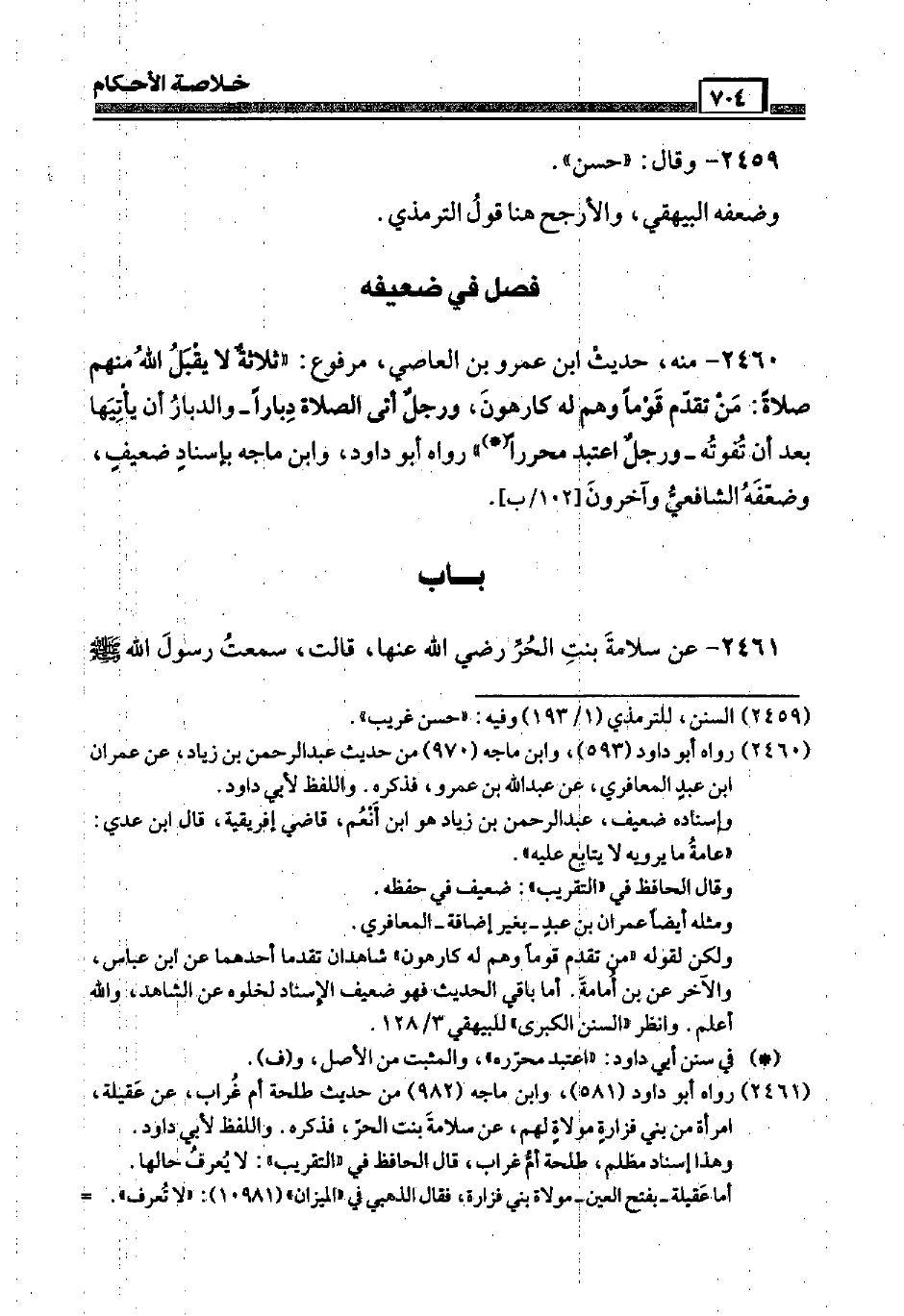 2460 - مِنْهُ، حَدِيث ابْن عَمْرو بن العَاصِي، مَرْفُوع: " ثَلَاثَة لَا يقبل الله مِنْهُم صَلَاة: من تقدم قوما وهم لَهُ كَارِهُون، وَرجل أَتَى الصَّلَاة دبارا - والدبار أَن يَأْتِيهَا بعد أَن تفوته - وَرجل اعتبد محررا " رَوَاهُ أَبُو دَاوُد، وَابْن ماجة بِإِسْنَاد ضَعِيف، وَضَعفه الشَّافِعِي وَآخَرُونَ [102 / ب] .