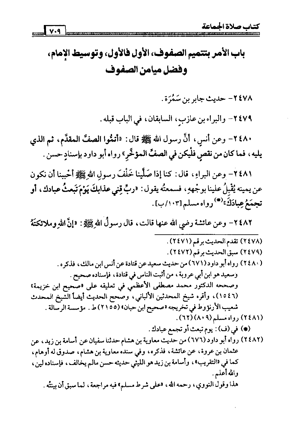 2480 - وَعَن أنس، أَن رَسُول الله صَلَّى اللَّهُ عَلَيْهِ وَسَلَّم َ قَالَ: " أَتموا الصَّفّ الْمُقدم، ثمَّ الَّذِي يَلِيهِ، فَمَا كَانَ من نقص فَلْيَكُن فِي الصَّفّ الْمُؤخر " رَوَاهُ أَبُو دَاوُد بِإِسْنَاد حسن.