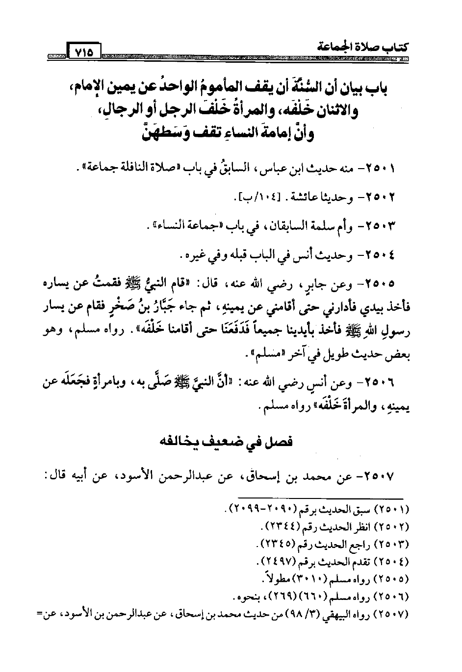2505 - وَعَن جَابر، رَضِيَ اللَّهُ عَنْه، قَالَ: " قَامَ النَّبِي صَلَّى اللَّهُ عَلَيْهِ وَسَلَّم َ فَقُمْت عَن يسَاره فَأخذ بيَدي فأدارني حَتَّى أقامني عَن يَمِينه، ثمَّ جَاءَ جَبَّار بن صَخْر فَقَامَ عَن يسَار رَسُول الله صَلَّى اللَّهُ عَلَيْهِ وَسَلَّم َ فَأخذ بِأَيْدِينَا جَمِيعًا فدفعنا حَتَّى أقامنا خَلفه ". رَوَاهُ مُسلم، وَهُوَ بعض حَدِيث طَوِيل فِي آخر " مُسلم ".