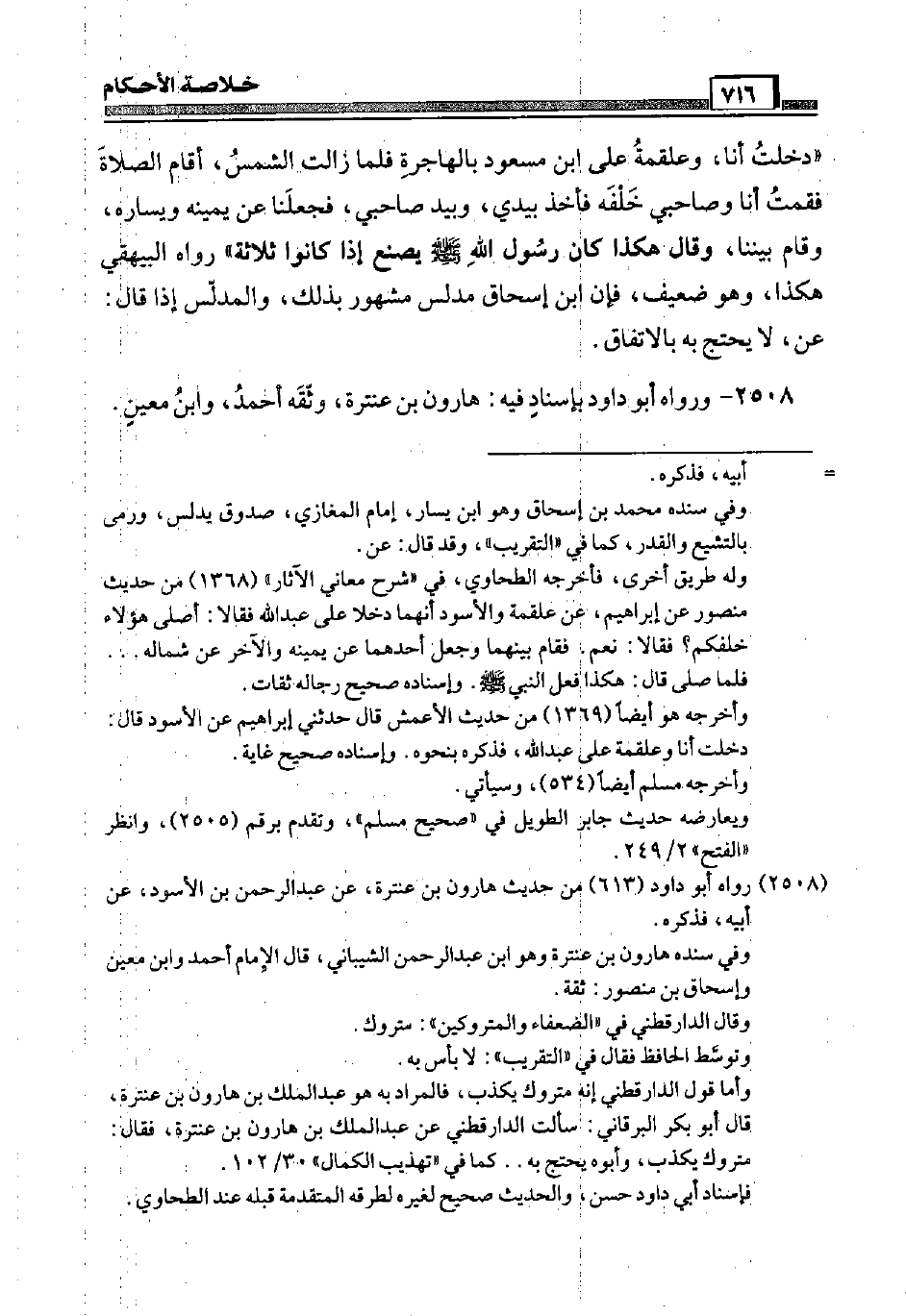 " دخلت أَنا، وعلقمة عَلَى ابْن مَسْعُود بالهاجرة فَلَمَّا زَالَت الشَّمْس، أَقَامَ الصَّلَاة فَقُمْت أَنا وصاحبي خَلفه فَأخذ بيَدي، وبيد صَاحِبي، فَجعلنَا عَن يَمِينه ويساره، وَقَامَ بَيْننَا، وَقَالَ هَكَذَا كَانَ رَسُول الله صَلَّى اللَّهُ عَلَيْهِ وَسَلَّم َ يصنع إِذا كَانُوا ثَلَاثَة " رَوَاهُ الْبَيْهَقِيّ هَكَذَا، وَهُوَ ضَعِيف، فَإِن ابْن إِسْحَاق مُدَلّس مَشْهُور بذلك، والمدلس إِذا قَالَ: عَن، لَا يحْتَج بِهِ بالِاتِّفَاقِ.