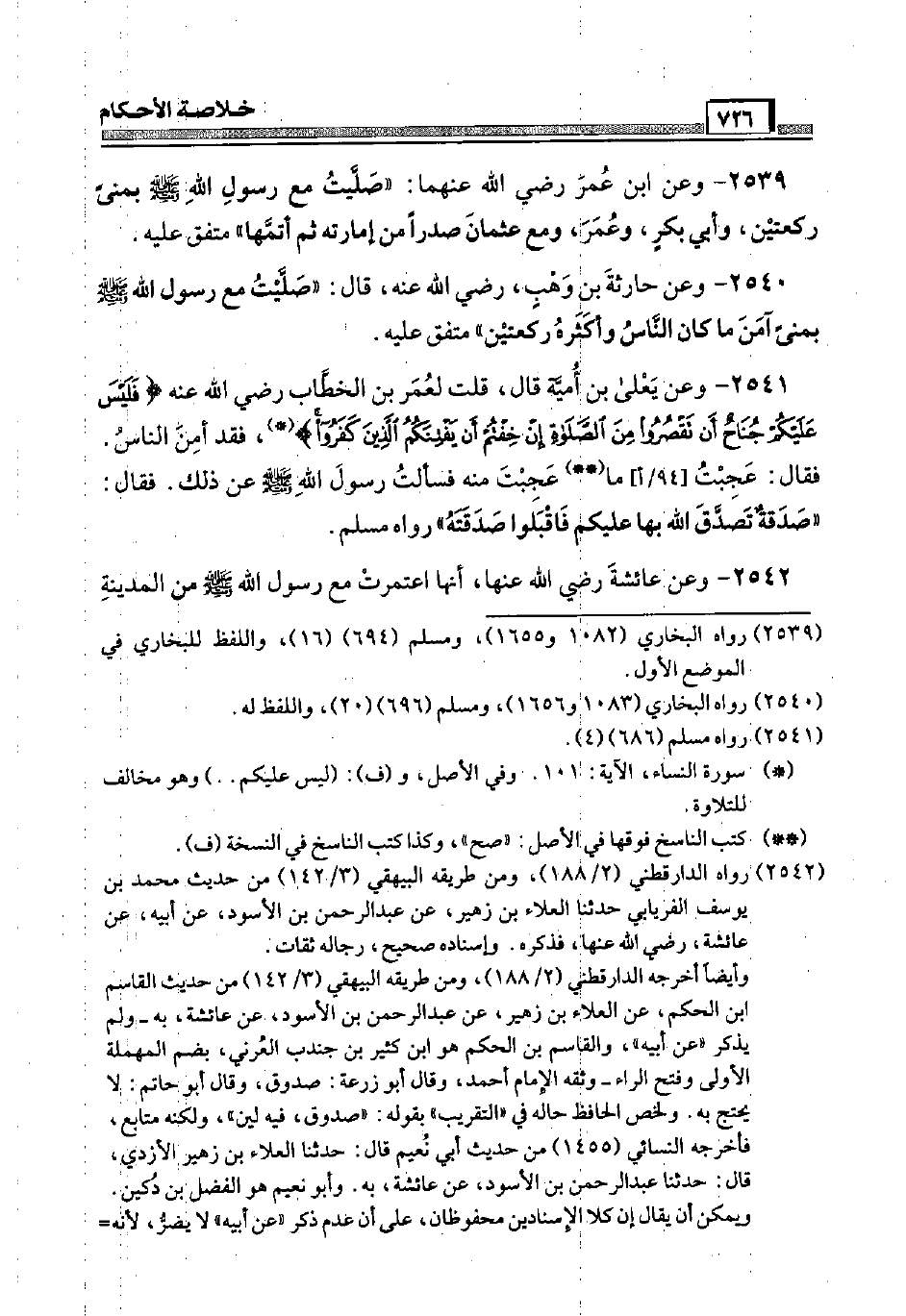 2539 - وَعَن ابْن عمر رَضِيَ اللَّهُ عَنْهما: " صليت مَعَ رَسُول الله صَلَّى اللَّهُ عَلَيْهِ وَسَلَّم َ بمنى رَكْعَتَيْنِ، وَأبي بكر، وَعمر، وَمَعَ عُثْمَان صَدرا من إمارته ثمَّ أتمهَا " مُتَّفق عَلَيْهِ.
