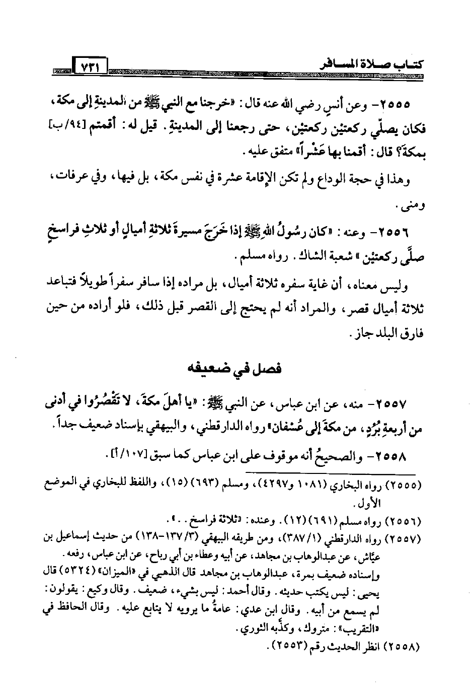 2557 - مِنْهُ، عَن ابْن عَبَّاس، عَن النَّبِي صَلَّى اللَّهُ عَلَيْهِ وَسَلَّم َ: " يَا أهل مَكَّة، لَا تقصرُوا فِي أدنَى من أَرْبَعَة برد، من مَكَّة إِلَى عسفان " رَوَاهُ الدَّارَقُطْنِيّ، وَالْبَيْهَقِيّ بِإِسْنَاد ضَعِيف جدا.