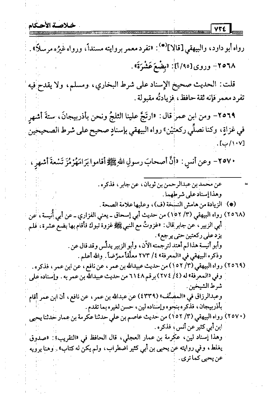 2569 - وَمن ابْن عمر قَالَ: " ارتج علينا الثَّلج وَنحن بِأَذربِيجَان، سِتَّة أشهر فِي غزَاة، وَكُنَّا نصلي رَكْعَتَيْنِ " رَوَاهُ الْبَيْهَقِيّ بِإِسْنَاد صَحِيح عَلَى شَرط الصَّحِيحَيْنِ [107 / ب] .