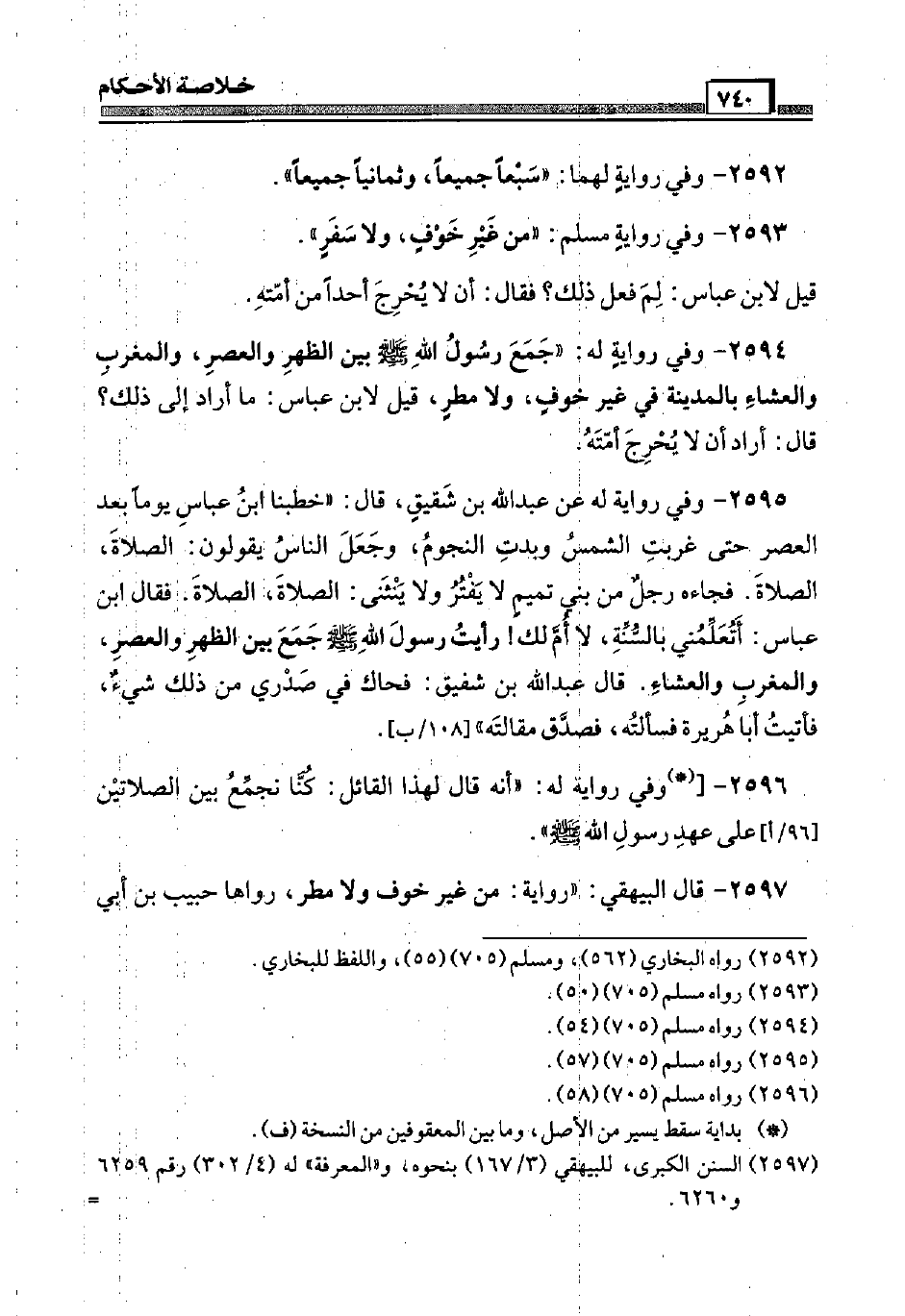 2593 - وَفِي رِوَايَة مُسلم: " من غير خوف، وَلَا سفر ". قيل لِابْنِ عَبَّاس: لم فعل ذَلِك؟ فَقَالَ: أَن لَا يخرج أحدا من أمته.
