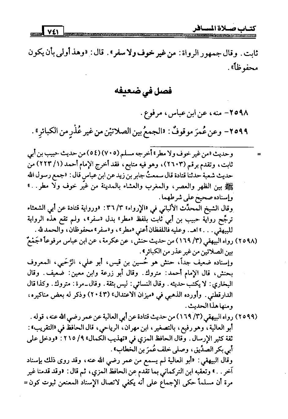 2599 - وَعمر عَن مَوْقُوف: " الْجمع بَين الصَّلَاتَيْنِ من غير عذر من الْكَبَائِر ".