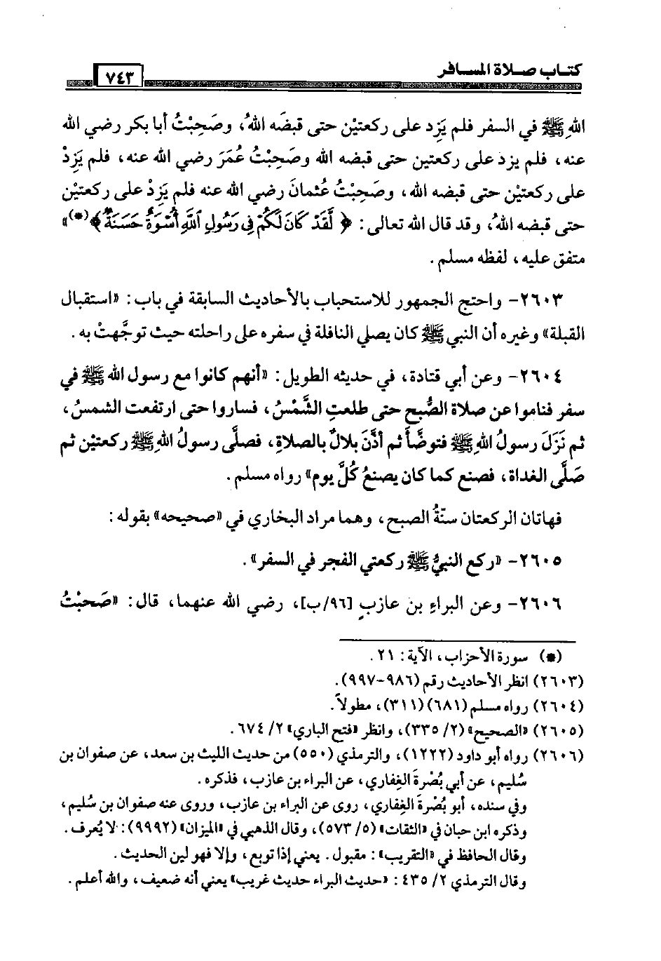 الله صَلَّى اللَّهُ عَلَيْهِ وَسَلَّم َ فِي السّفر فَلم يزدْ عَلَى رَكْعَتَيْنِ حَتَّى قَبضه الله، وصحبت أَبَا بكر رَضِيَ اللَّهُ عَنْه، فَلم يزدْ عَلَى رَكْعَتَيْنِ حَتَّى قَبضه الله وصحبت عمر رَضِيَ اللَّهُ عَنْه، فَلم يزدْ عَلَى رَكْعَتَيْنِ حَتَّى قَبضه الله، وصحبت عُثْمَان رَضِيَ اللَّهُ عَنْه فَلم يزدْ عَلَى رَكْعَتَيْنِ حَتَّى قَبضه الله، وَقد قَالَ الله تَعَالَى: {لقد كَانَ لكم فِي رَسُول الله أُسْوَة حَسَنَة} " مُتَّفق عَلَيْهِ، لَفظه مُسلم.