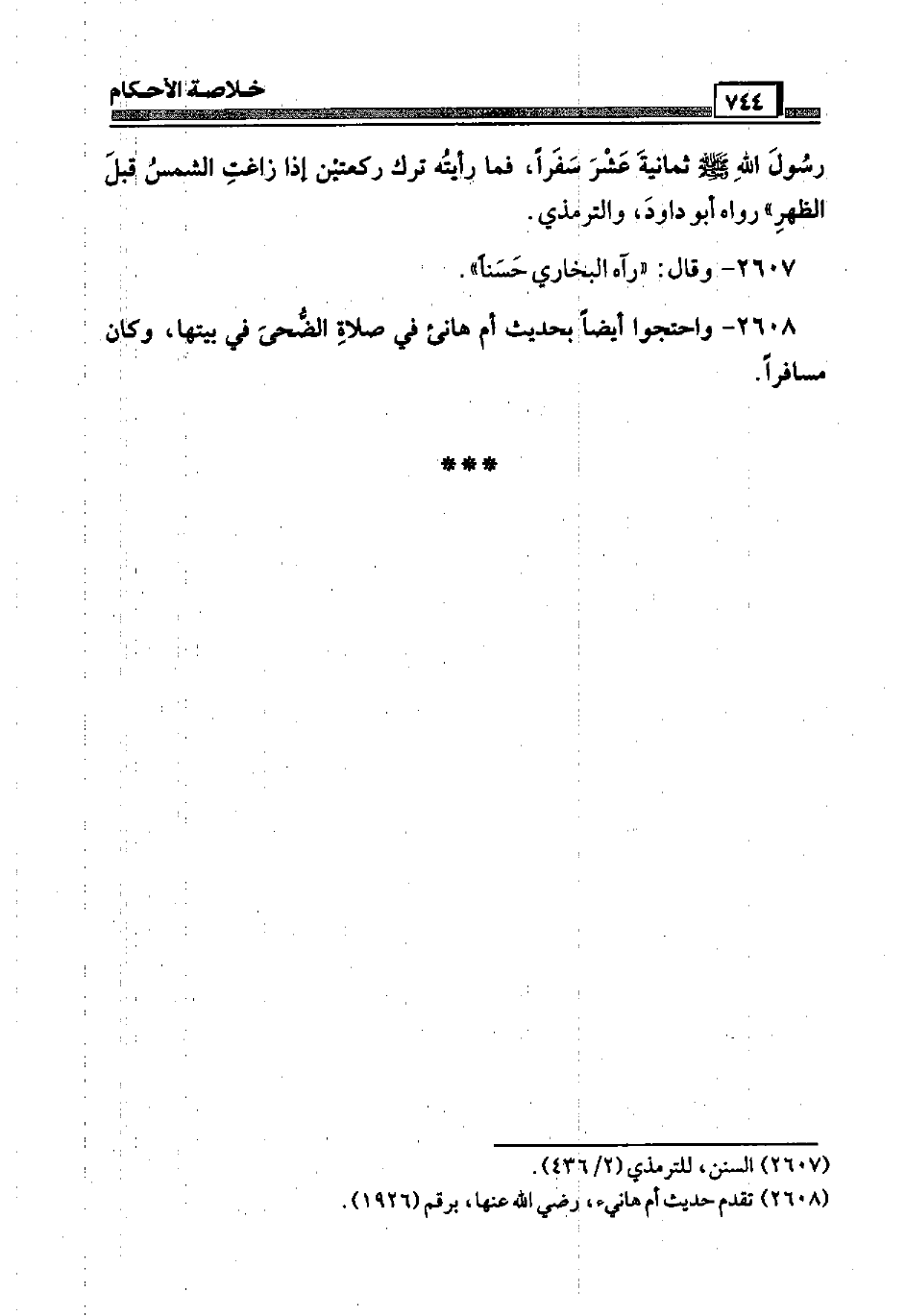 2608 - وَاحْتَجُّوا أَيْضا بِحَدِيث أم هَانِئ فِي صَلَاة الضُّحَى فِي بَيتهَا، وَكَانَ مُسَافِرًا.