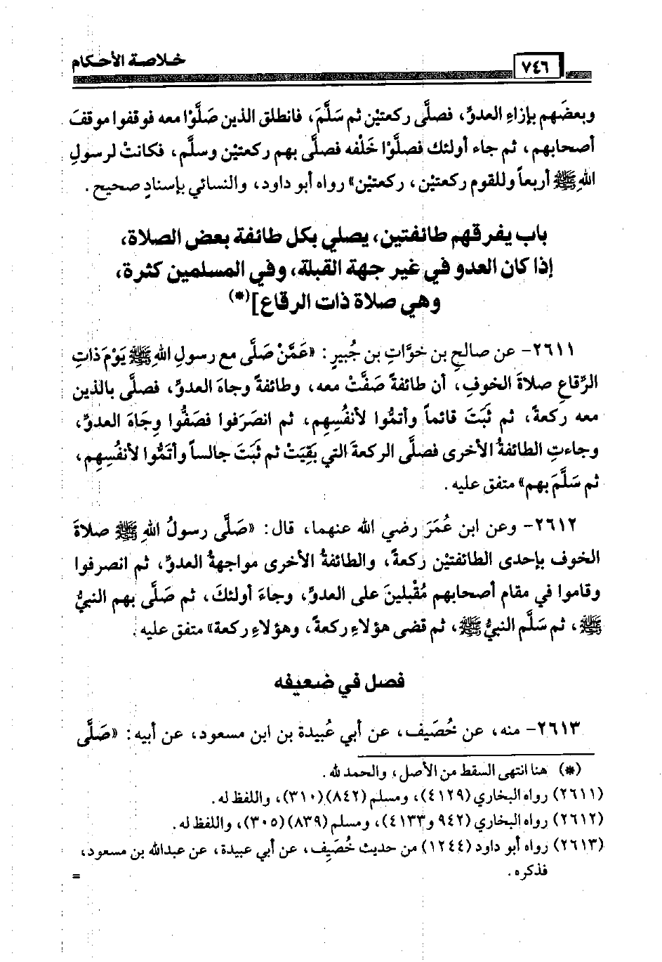 2611 - عَن صَالح بن خوَّات بن جُبَير: " عمَّن صَلَّى مَعَ رَسُول الله صَلَّى اللَّهُ عَلَيْهِ وَسَلَّم َ يَوْم ذَات الرّقاع صَلَاة الْخَوْف، أَن طَائِفَة صفّت مَعَه، وَطَائِفَة وجاه الْعَدو، فَصَلى بالذين مَعَه رَكْعَة، ثمَّ ثَبت قَائِما وَأَتمُّوا لأَنْفُسِهِمْ، ثمَّ انصرفوا فصفوا وجاه الْعَدو، وَجَاءَت الطَّائِفَة الْأُخْرَى فَصَلى الرَّكْعَة الَّتِي بقيت ثمَّ ثَبت جَالِسا وَأَتمُّوا لأَنْفُسِهِمْ ثمَّ سلم بهم " مُتَّفق عَلَيْهِ.
